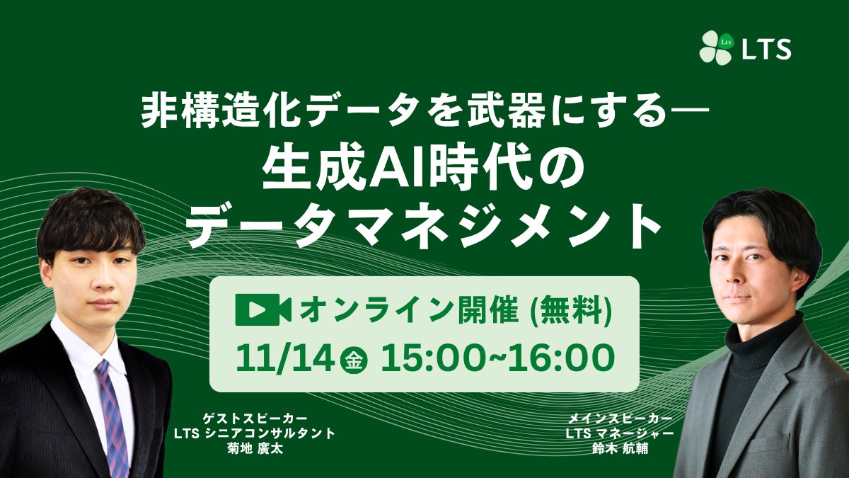 株式会社エル・ティー・エス(本社:東京都港区、代表取締役社長:樺島 弘明、以下LTS)は、自社主催セミナー「非構造化データを武器にする―生成AI時代のデータマネジメント」を11月14日(金)午後3時より、オンライン形式で開催します。(参加費無料)