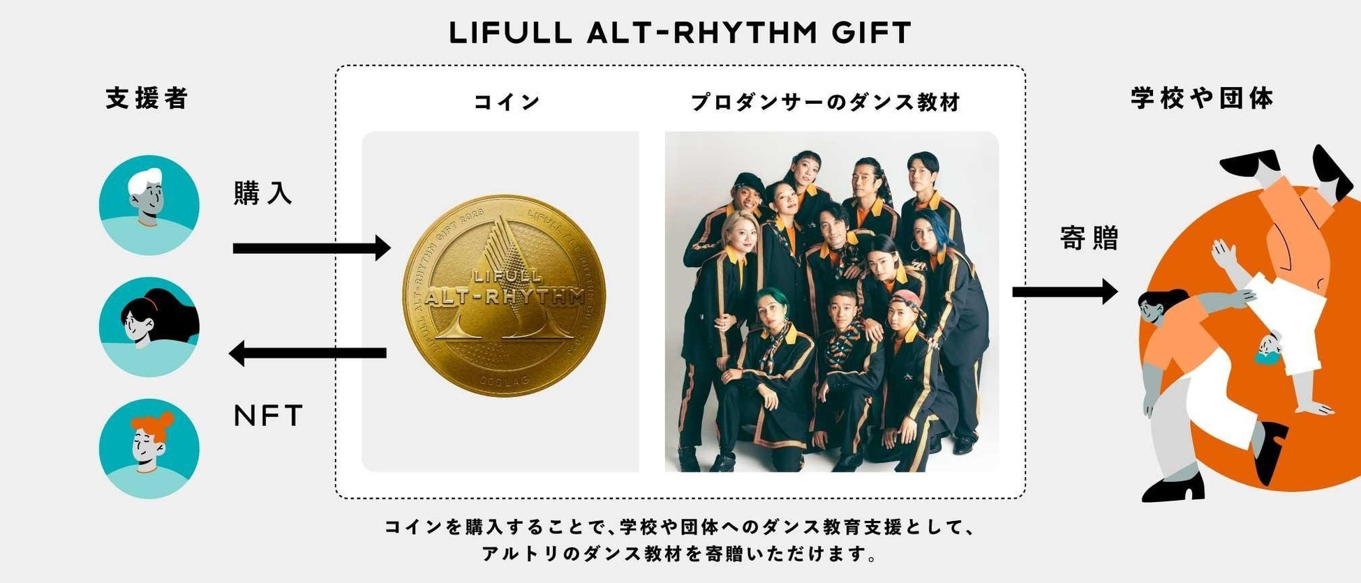 プロジェクト『LIFULL ALT-RHYTHM GIFT』では、NFT(Non-fungible Token:非代替性トークン)を使用した仕組みで運用し、アルトリのダンサーが基礎を教えるダンス教材(レッスンDVD)を支援先の学校や団体の子どもたちに贈ります。支援者は、支援したい学校や教育団体の支援コインを購入することで、支援先の子どもたちに人数分のダンス教材(レッスンDVD)を寄贈することができます。