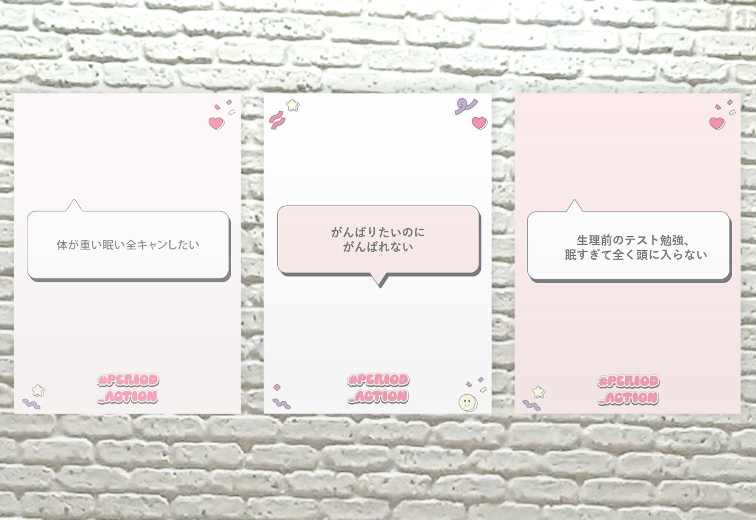 上位20個の「声」を集めました。“国際生理の日”の当日である10月19日にはこれらの取り組みで厳選された「心の叫び」を館内に掲示し10代~20代の女性が多く集まるSHIBUYA109渋谷店において、共感しあえる空間づくりを目指します。