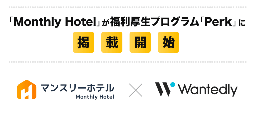 ウォンテッドリー株式会社が運営する福利厚生サービス「Perk」では「シゴトの挑戦」を支援する多彩なサービスを提供しております。「Monthly Hotel」は新型コロナウイルスにより働き方や暮らし方にも様々な変化が起きる中、ワーケーションや拠点利用、出張や住まいなど新しいホテルの活用を提案するためサービス提供を開始しました。このたび、PerkのVisionに共感し、サービス掲載パートナーとして参画することを決定しました。