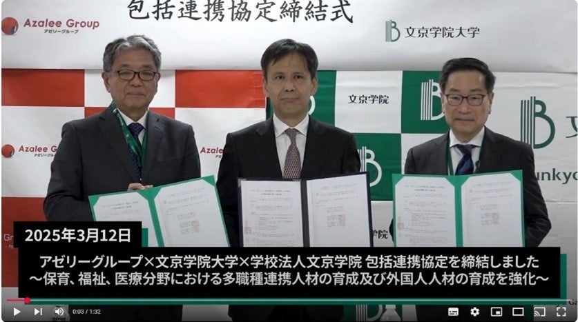 文京学院大学(学長:福井 勉)および学校法人文京学院(学院長・理事長:島田 昌和)は、2025年3月12日にアゼリーグループ(代表:来栖 宏二)と包括連携協定を締結したことをお知らせします。本協定は、相互が協力と連携を深め、大学の研究成果などを社会へより円滑かつ広く還元すること、社会の発展と人材の育成に寄与することを目的としています。なお、本締結に伴い、包括連携協定締結式に関するダイジェスト動画をYouTubeにて配信します。