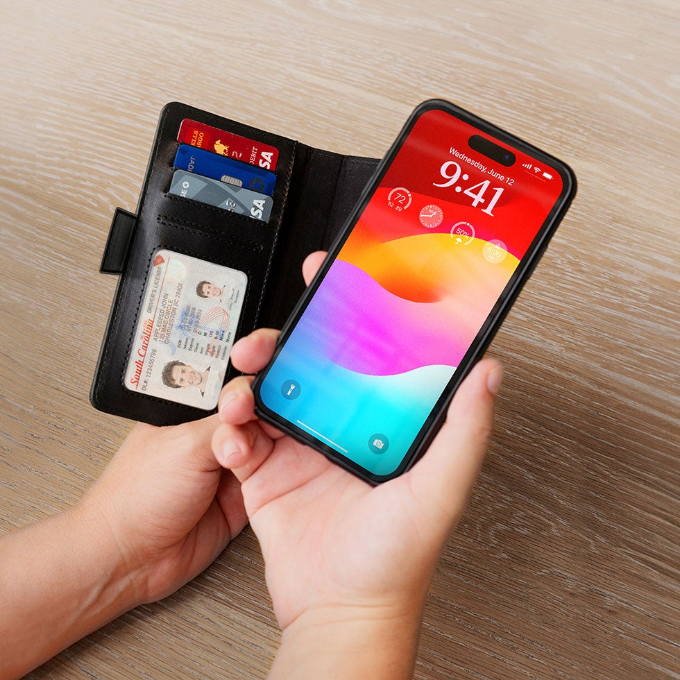 取り外し可能な洋書風保護ケース、リアル財布機能、ハンズフリーのスタンドモードとビデオ通話などで3つ機能が一つになったiPhoneケースです。