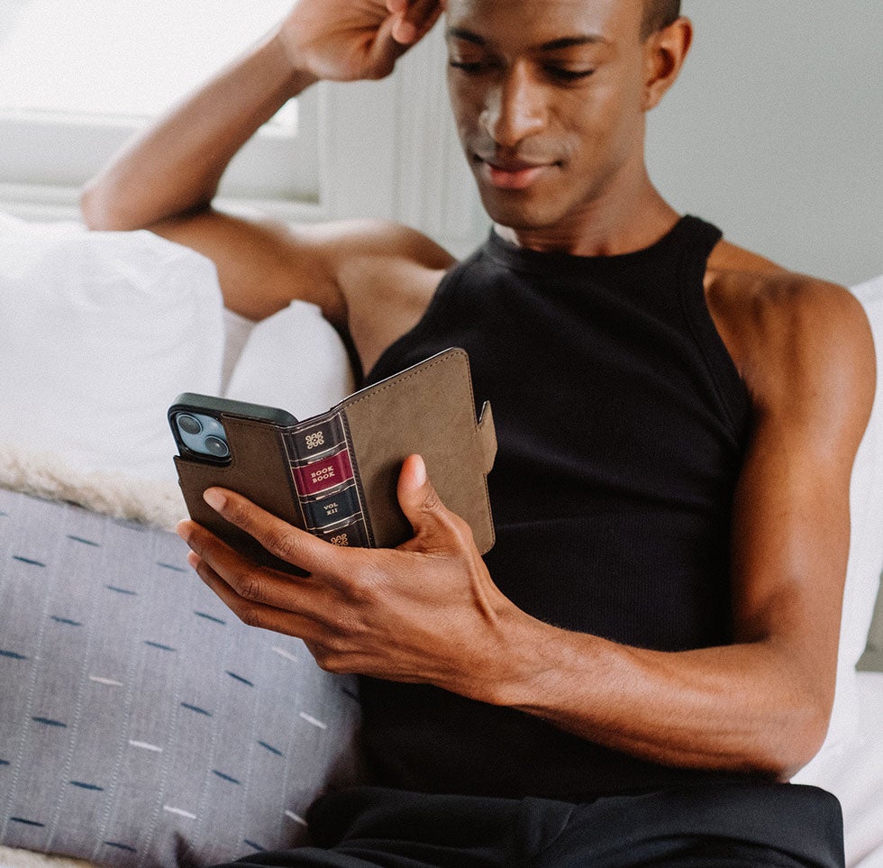 フルグレインレザーを手作業で仕上げたBookBookは、使い込むほどに艶が増し、柔らかくなります。内側のマグネット付き本革ケースがフレームを盛り上げ表面を保護、さらに裏地のマイクロファイバーがiPhoneに傷がつくのを防ぎます。