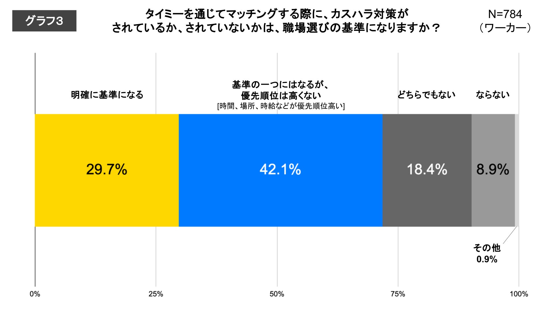 また、「カスハラ対策がされている事業者であるか否かは、職場選びの基準になるか?」との問いに対して、基準になる傾向としての回答は約70%(明確な基準になる29.7%+基準の一つになるけど優先順位は高くない42.1%)であった(※グラフ3参照)こともふまえ、周知を通じ、スポットワーク勤務時におけるカスハラ対応への不安低減をはかり、より良い「働きたい」と「働いてほしい」のマッチングを実現していきます。