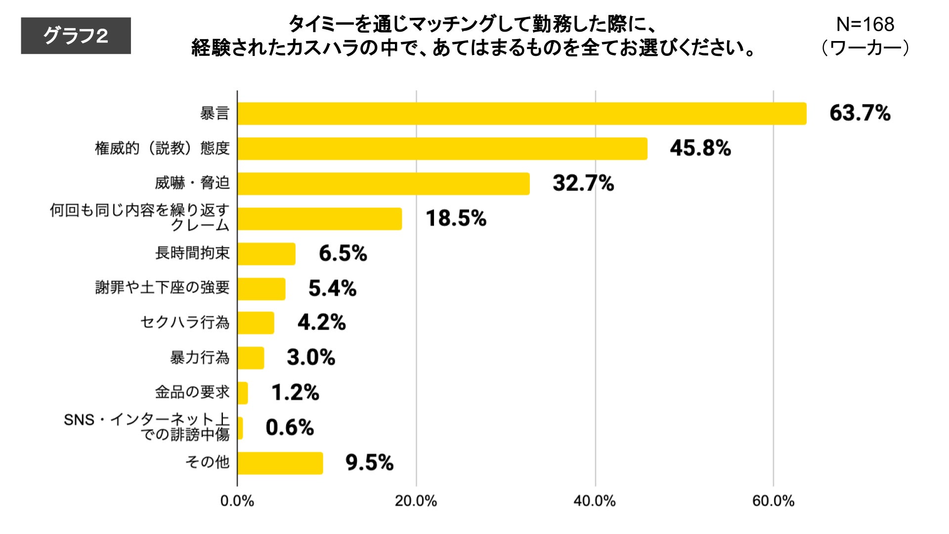 タイミーでマッチングした勤務時に経験したカスハラ行為は、「暴言」が63.7%と最も多く、「権威的(説教)態度」が45.8%と2番目に多い結果でした。