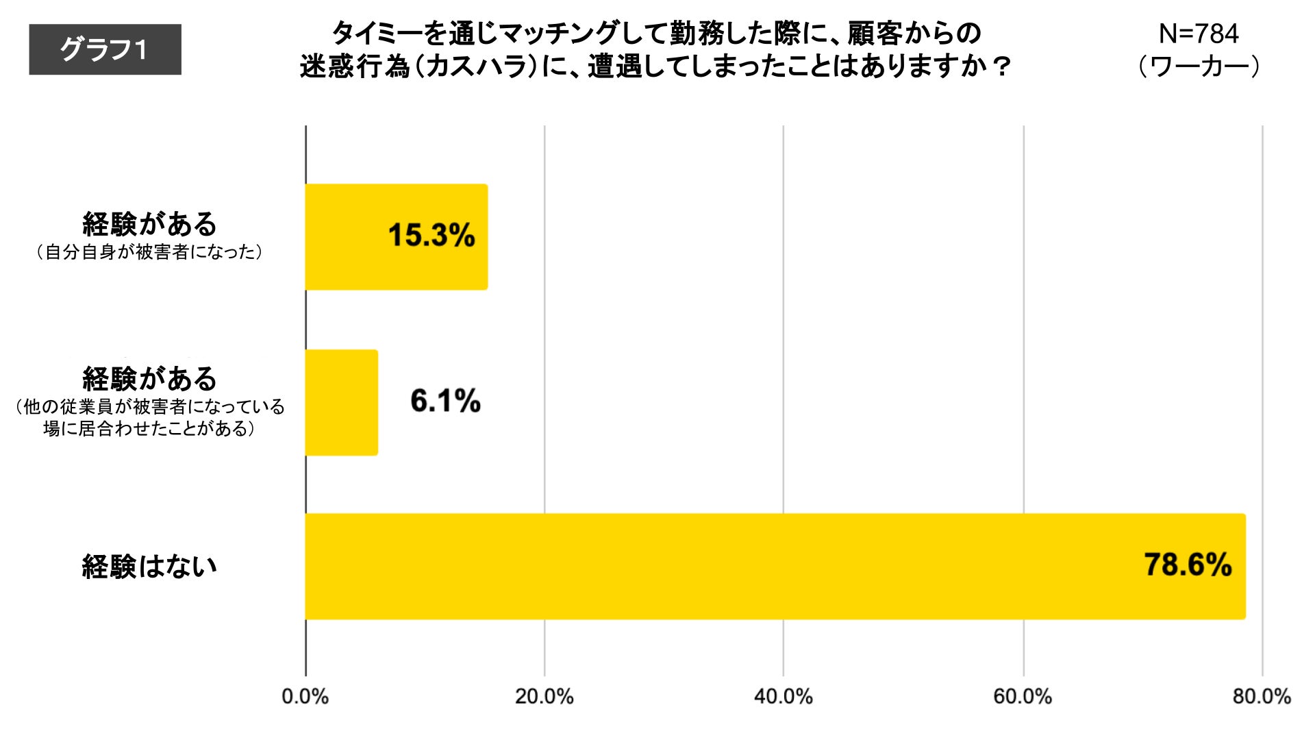 タイミーでマッチングした勤務において、就業先の顧客からのカスハラに遭遇してしまったことがある方は、「自分自身が被害者になった(15.3%)」、「他の従業員が被害者になっている場に居合わせたことがある(6.1%)」でした。これは、パーソル総合研究所が公表した調査結果「過去にカスハラ被害を受けた経験がある(35.5%)」(※1)の値と比較して、約20ポイント低い結果でした。