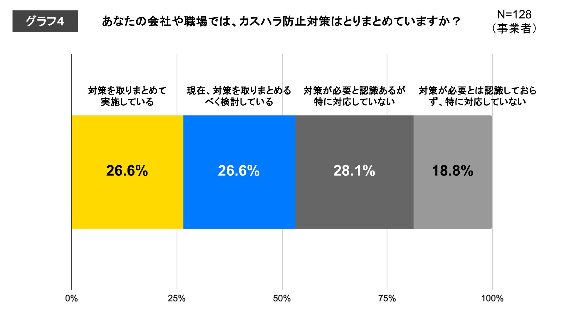 会社や職場での現在のカスハラ防止対策状況についての設問に対する回答では、「対策を取りまとめて実施している」および「現在、対策を取りまとめるべく検討している」と回答した事業者がともに26.6%と、前向きに対応をしている事業者が約半数の結果となりました。