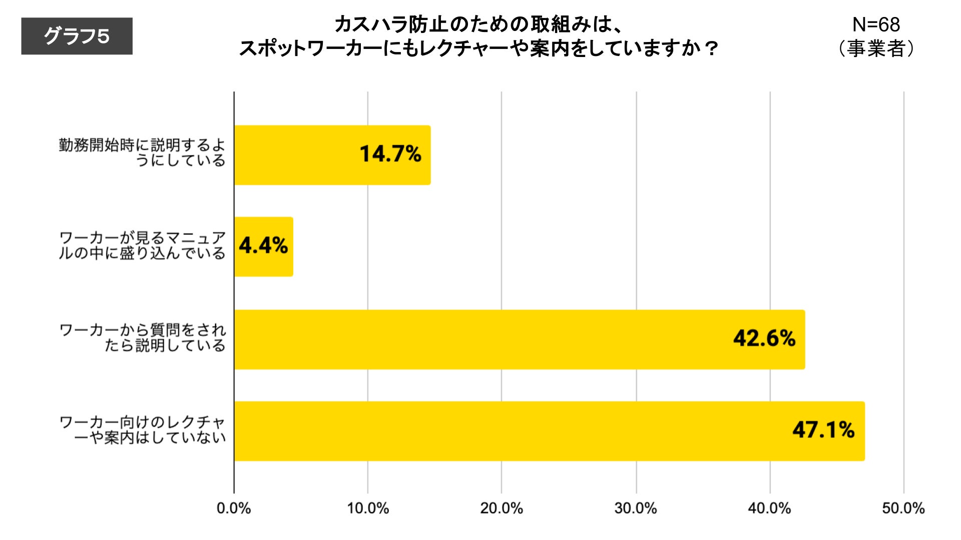 事業者へのアンケート調査の回答では、約半数が「会社や職場としてカスハラ防止対策を取りまとめて実施している/取りまとめるべく検討している」という結果でした(※グラフ4参照)。しかし、その事業者のうちスポットワーカーにもその内容の説明や案内をしている事業者は14.7%と少なく、「ワーカーから質問をされたら説明している(42.6%)」、「ワーカー向けのレクチャーや案内はしていない(47.1%)」など、ワーカーに対して能動的に説明や案内がされていない事業者が多数であることがわかりました(※グラフ5参照)。