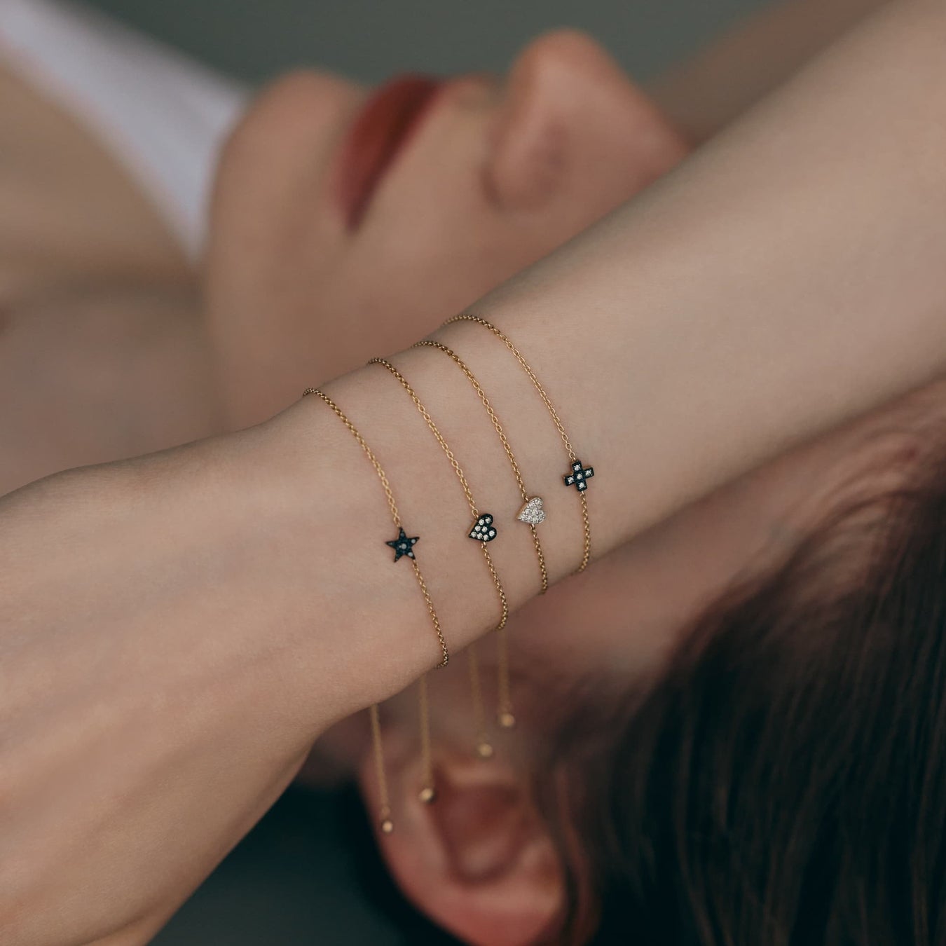 首筋や指の側面にさりげなくあしらわれた極小サイズのタトゥーを、天然ブラウンダイヤモンドで表現したジュエリー。