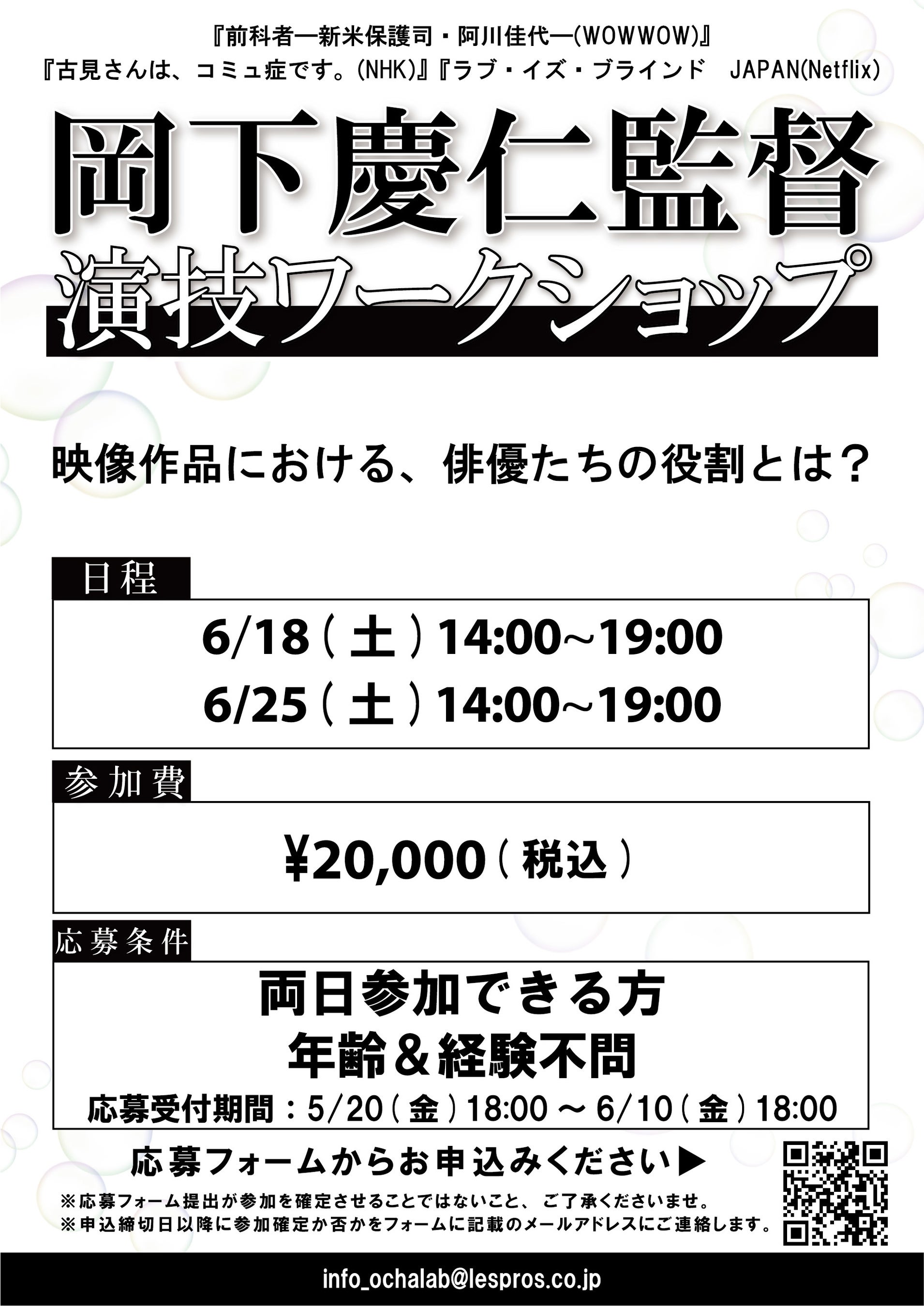 今回のワークショップではそんな現場の雰囲気を再現しつつ、参加する皆さまの「魅力」を引き出せたら、そして何よりも演技の楽しさを再確認していただけたらと思います。