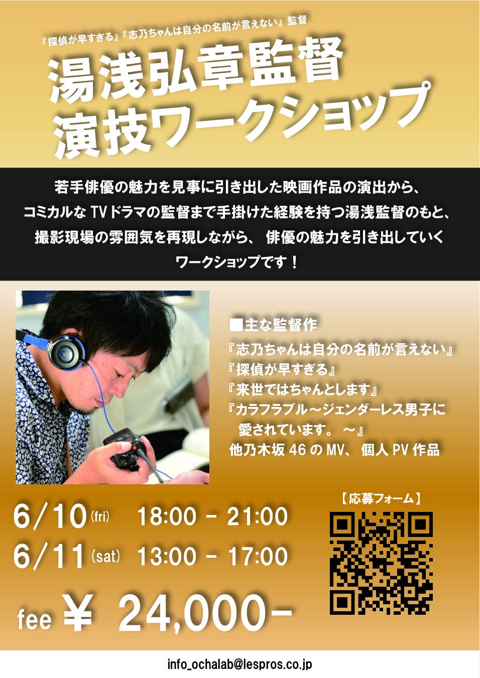 本ワークショップでは、4月クールも『探偵が早すぎる~春のトリック返し祭り~』にて監督を務められている湯浅弘章監督のもと、事前に用意した台本を使用し、参加者の魅力を引き出しながら、演技の楽しさを感じられるワークショップを行います。