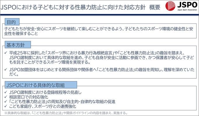 JSPOでは、この対応方針を踏まえ、子どもたちが安全・安心にスポーツを継続して楽しむことができるよう、子どもたちのスポーツ環境の健全性と安全性の確保に向け、各種対応を検討してまいります。