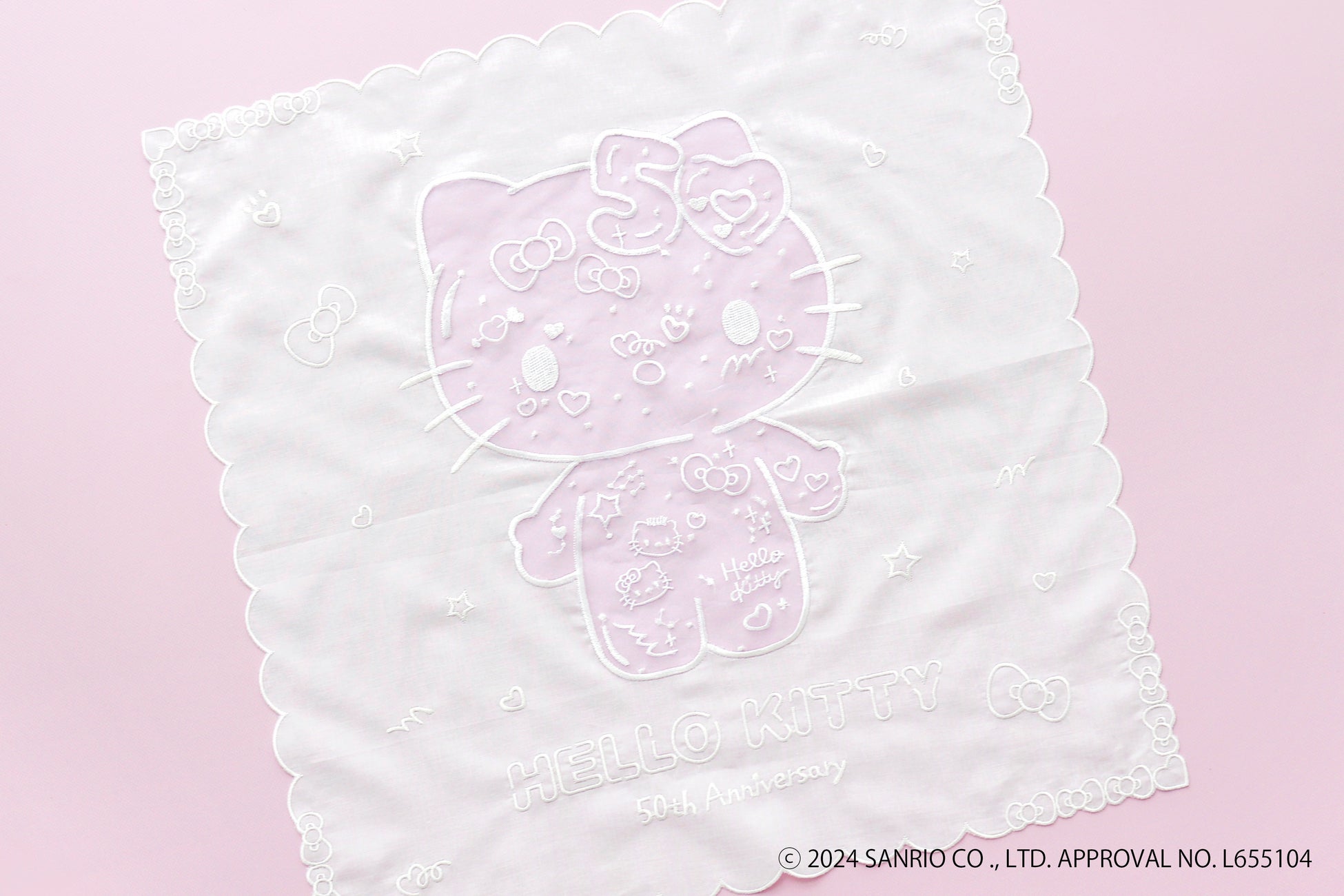 ハローキティ部分にはオーガンジーを使用し、まわりの生地、刺繍共に全てを白で統一。クリアな透明感を表現しました。柄は全て刺繍で表現しており、透け感のあるオーガンジーに刺繍を施すことによって奥行き感のある仕上がりに。ハローキティ50周年にぴったりな豪華な一枚です。