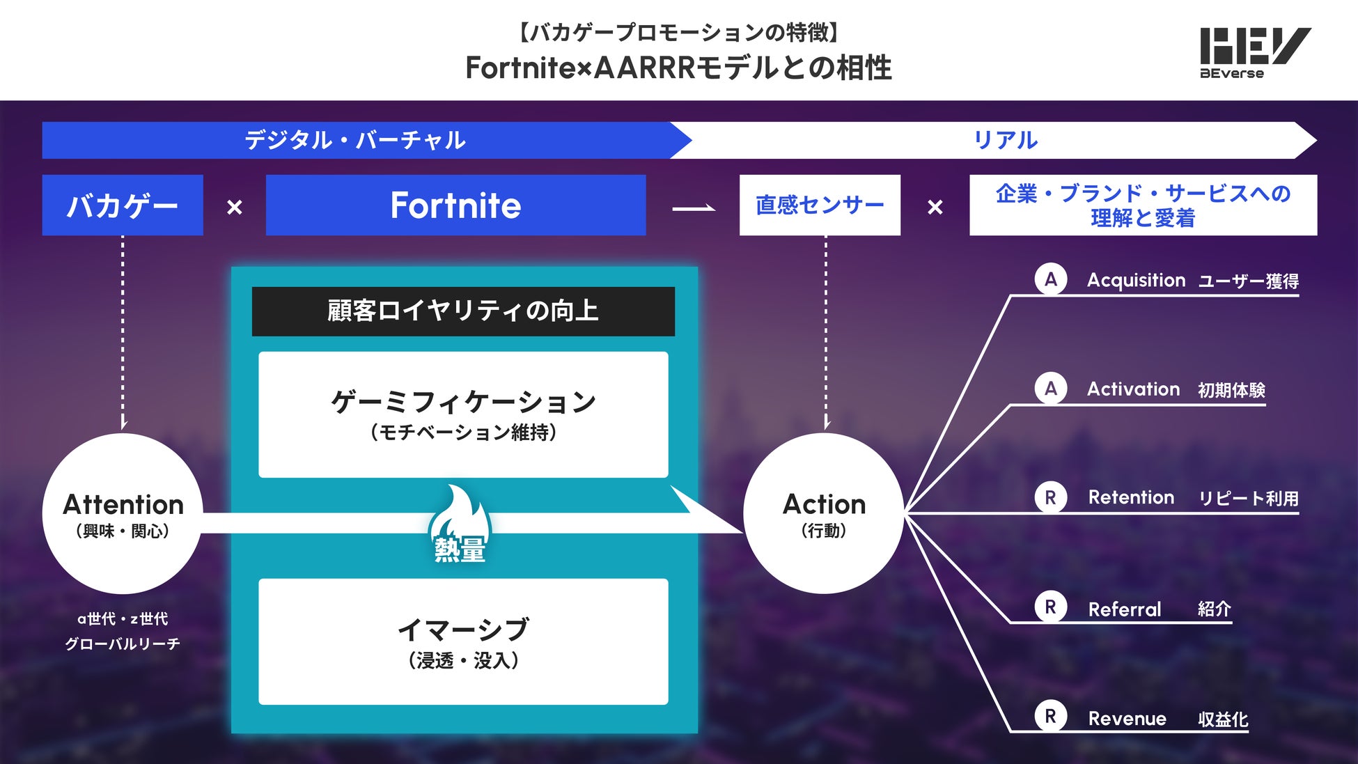 バカゲープロモーションは、Fortniteを起点としてα世代やz世代に対してAttention(興味・関心)を創出し、メタバース空間とゲームの特性による顧客ロイヤリティの向上・熱量を蓄積していきます。