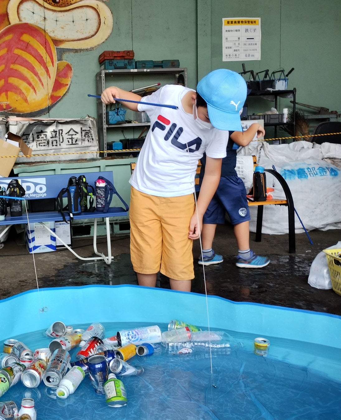 その後、実際にスチール缶とアルミ缶の違いを体験してもらうために、空き缶釣りを行いました。児童は、空き缶のリサイクルマークをチェックしながら、釣りを楽しみました。最後は空き缶を植木鉢にした缶に装飾をして持ち帰りました。