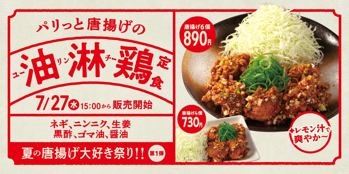 お子様から大人まで人気の根強い唐揚げを満足に味わえる、”夏の唐揚げ大好き祭り”を開催します。松のやの唐揚げは、生姜・にんにく・鶏ガラスープを使用した特製揉みダレにじっくりと漬け込んでパリっととジューシーに揚げた本格唐揚げ。たっぷりのネギにゴマ油と醤油ベースの香味ダレをかけた「油淋鶏定食」は昨年販売時、"トリ"こになる人続出の逸品です。さらに今年はフレッシュなレモン汁をかけてさっぱりと風味豊かに仕上げました。「本格唐揚げ」に香味ダレが絡んだワンランク上の唐揚げ体験を今夏も松のやでご体感ください。