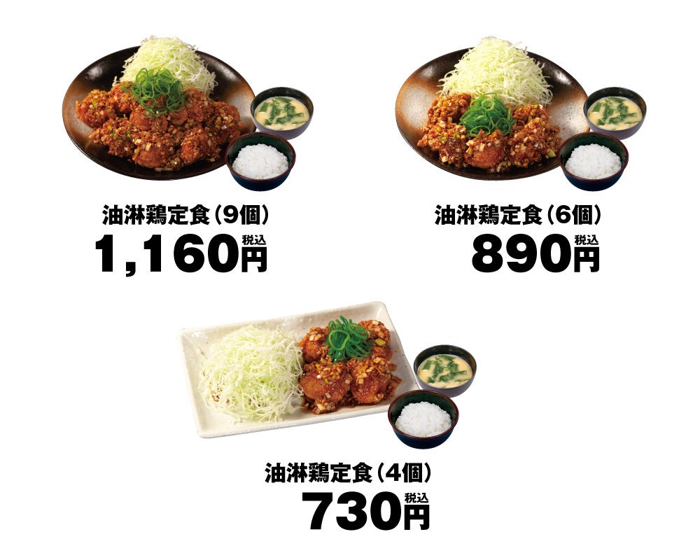 | 商品名 油淋鶏定食(4個) 730円 油淋鶏定食(6個) 890円 油淋鶏定食(9個) 1,160円 ※お持ち帰りいただけます。お持ち帰りのみそ汁は、別途60円でお買い求めいただけます。 ※全て税込価格です。また、店内・お持ち帰りの税込価格は同一です。 発売日 2022年7月27日(水)午後3時 対象店舗 一部店舗を除く全国の松のや・松乃家 ※高速PA店舗・沖縄店舗を除く |