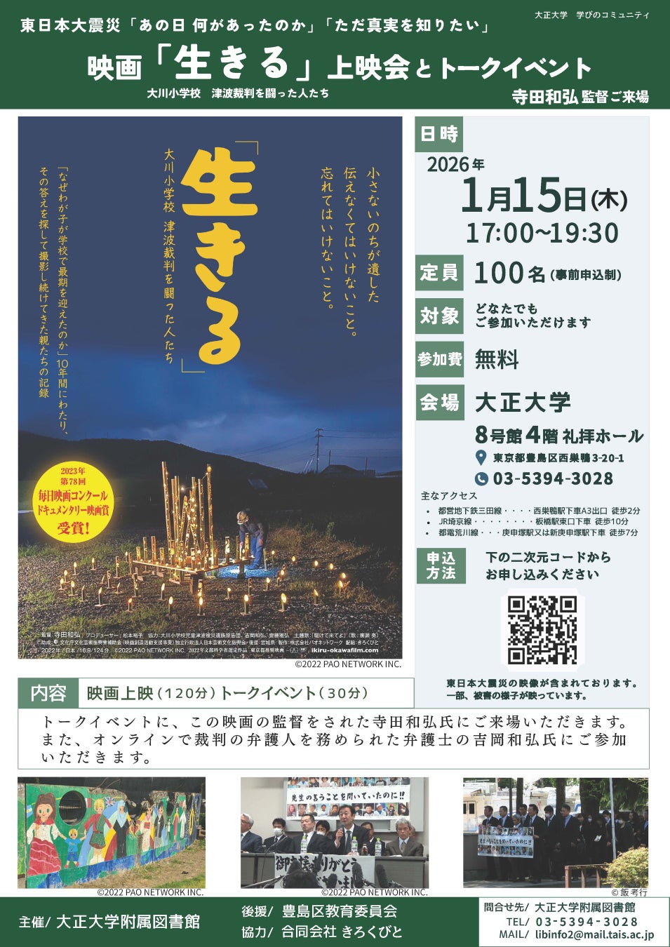 大正大学(学長:神達知純、所在地:東京都豊島区)附属図書館は、2026年1月15日(木)に映画『「生きる」 大川小学校 津波裁判を闘った人たち』 上映会とトークイベントを開催します。