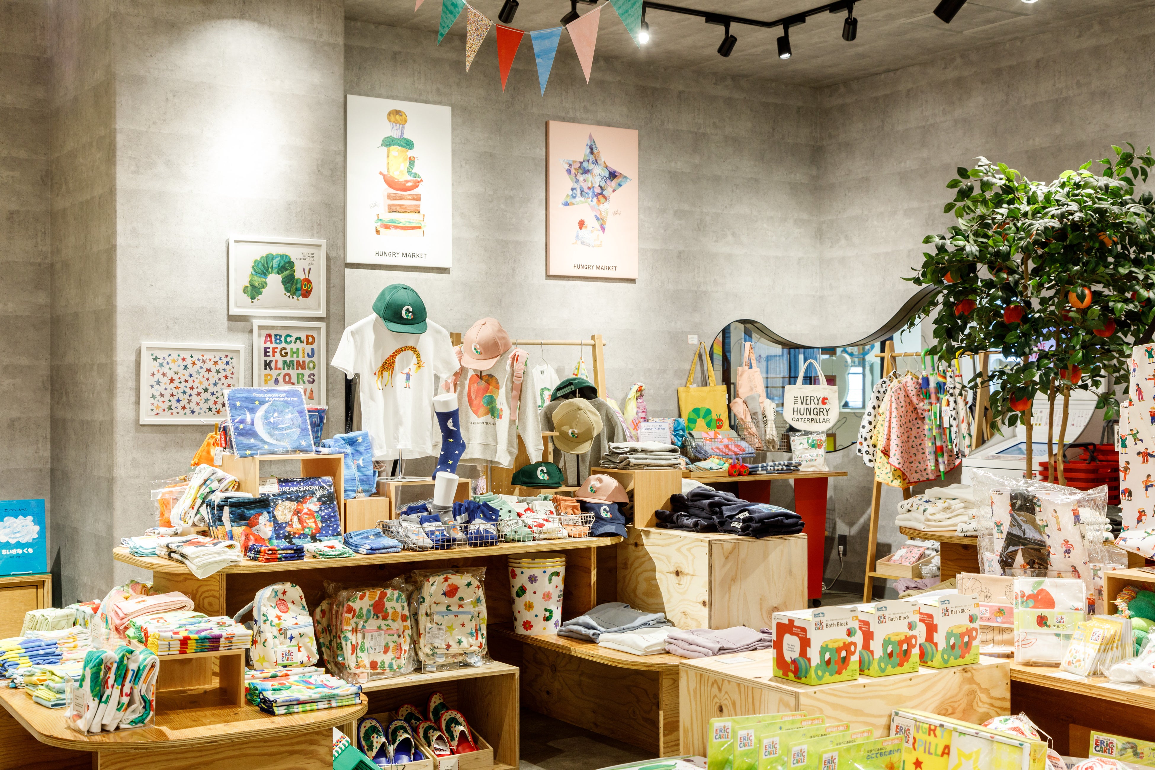 HUNGRY MARKETは、PLAY! PARK ERIC CARLEに隣接する、エリック・カールのグッズをセレクトした絵本雑貨の専門店です。世界的なベストセラー絵本『はらぺこあおむし』はもちろん、『できるかな?あたまからつまさきまで』や『パパ、お月さまとって!』『ゆめのゆき』など、様々なエリック・カール作品の絵本雑貨を豊富に取り揃えています。