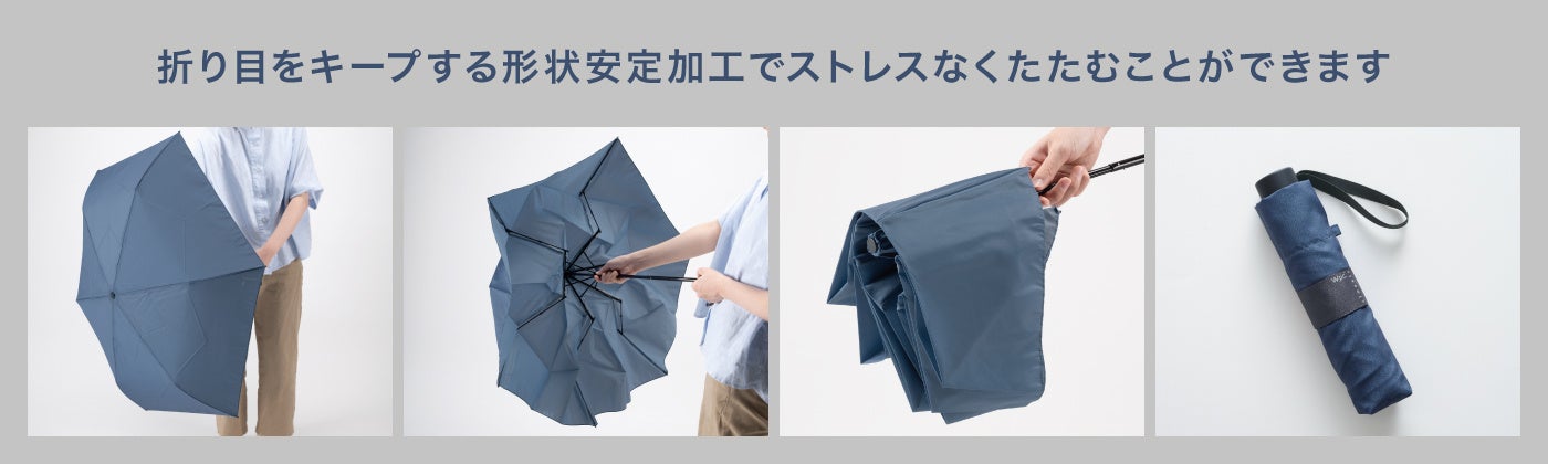 形状安定加工を採用することで、折り目をキープ。使用後はストレスなく一瞬できれいにたたむことができます。