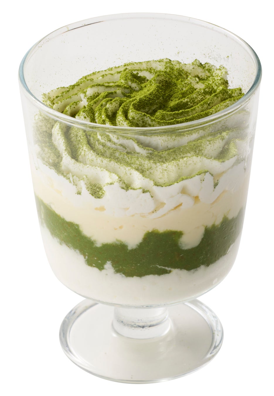 ホイップクリーム、抹茶風味のスポンジケーキ、ティラミスクリームを重ね、仕上げに抹茶パウダーをかけた濃厚なティラミス風パフェです。