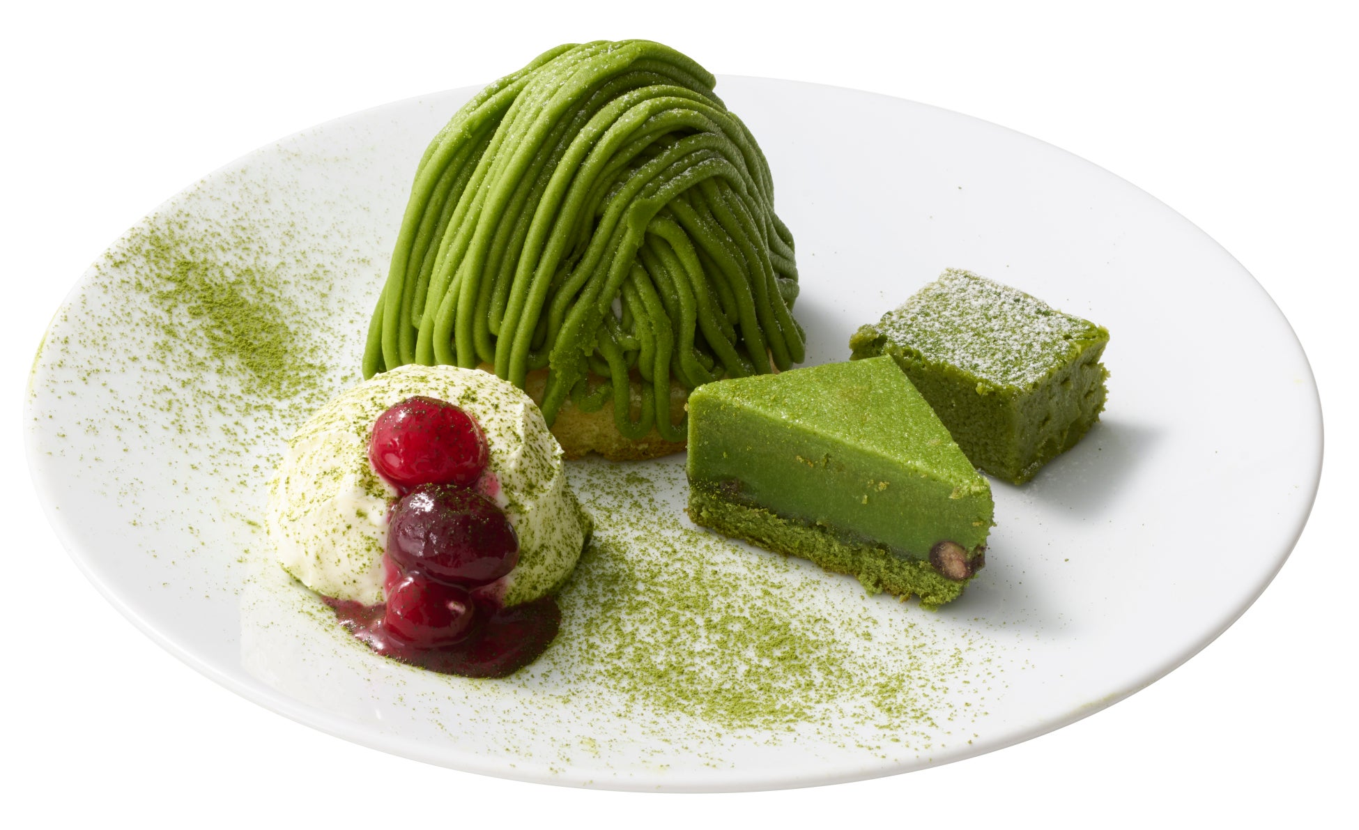 抹茶テリーヌ、抹茶モンブラン、抹茶ガトーショコラ、クレームダンジュ風の4種のデザートが楽しめる抹茶づくしのデザートセットです。