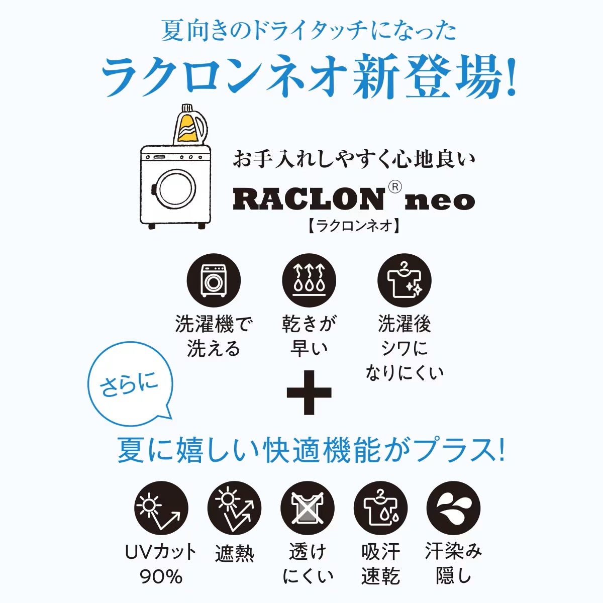 コットンのようなナチュラルな風合いと、洗濯を繰り返してもシワになりにくいイージーケア性が特長の「ラクロン®」にUVカットや遮熱、吸汗速乾など夏にうれしい機能を加えたのが「ラクロン®neo」です。