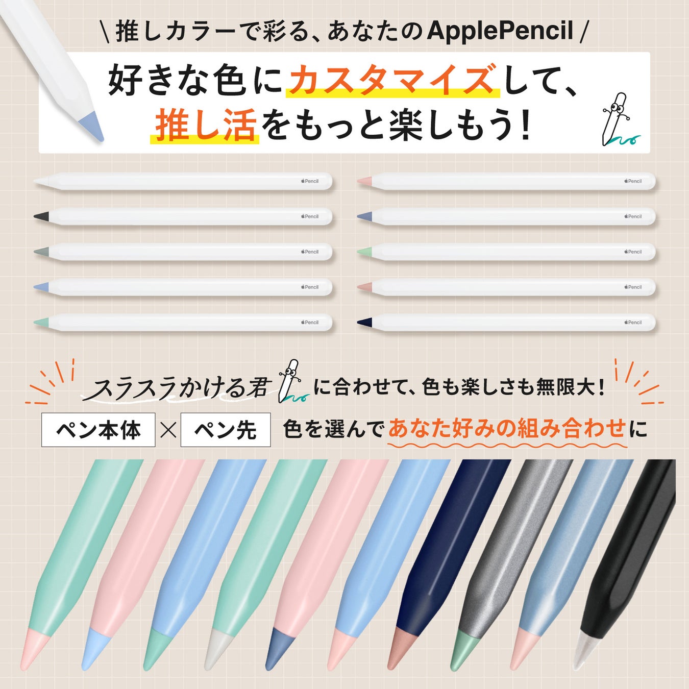スラスラかけるくん交換用、樹脂製替え芯が新登場!本体とペン先を推しカプや概念カラーでカスタマイズ。アップルペンシル互換で全世代対応、全10色展開で推し活に最適。なめらかな書き心地で推しをもっと身近に!