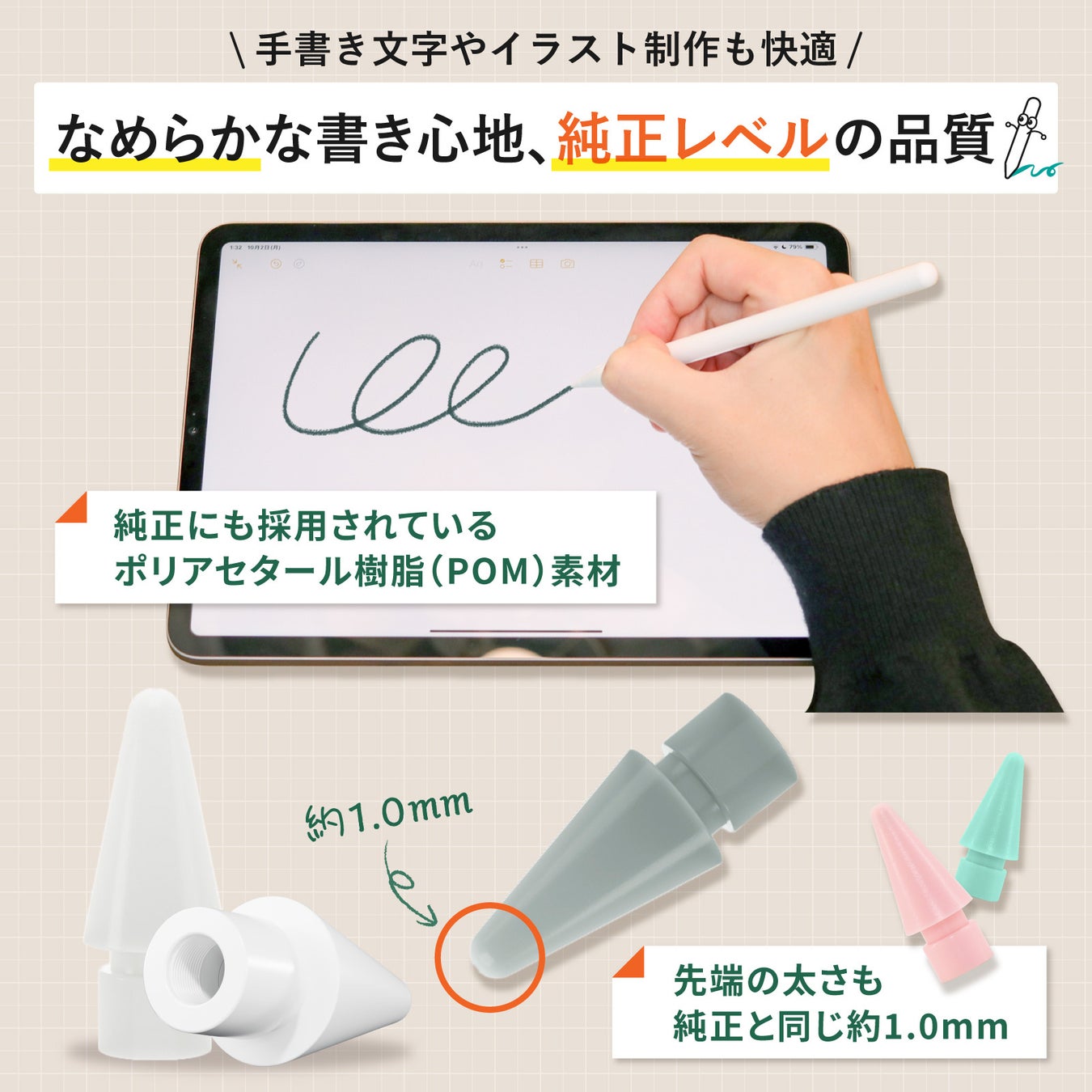 さらに、Apple Pencil(第1世代 / 第2世代 / USB-C / Pro)にも対応しており、Apple Pencilのペン先としても使用可能!
