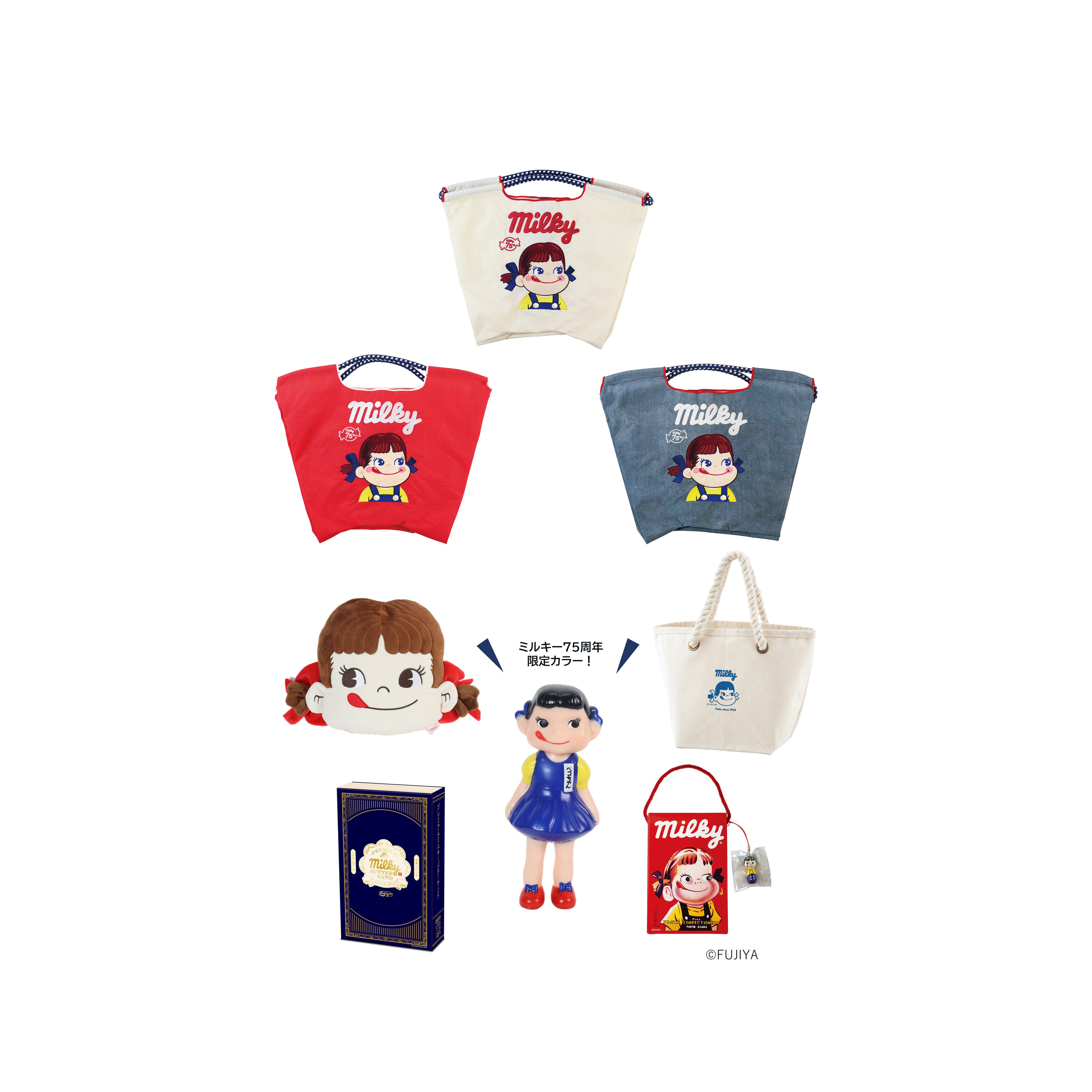 青いワンピースを着た、「ミルキー」発売75周年記念のオリジナルデザインの「レトロペコちゃんソフビ人形(ミルキー75周年デザイン)」が今回初登場! さらに、もちもち素材でお部屋に飾ってインテリアとしてもお楽しみいただける「ペコちゃん もっちりフェイスミニクッション」やちょっとしたお出かけに便利な「厚生地ロープハンドルランチトート(ミルキー)」のほか、西洋菓子舗 不二家の人気商品である「プレミアムミルキーバターサンド(5個入)」などを詰め合わせたお得なお楽しみ袋です。数量限定です。