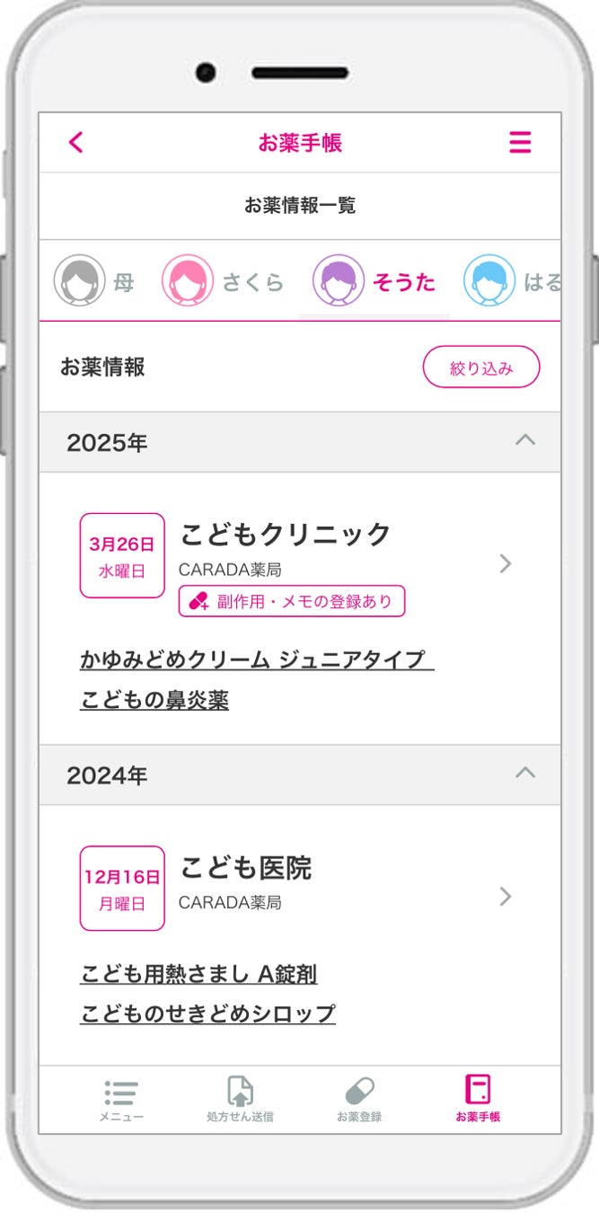 ◆『母子モ』アプリからそのまま電子お薬手帳に遷移。処方薬の記録・管理が簡単に!