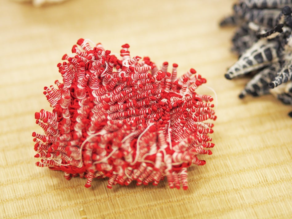 「SHIBORI BAG」に使われている絞りの手法は摘んだ生地を先まで巻き上げる「蜘蛛絞り」、摘んだ生地の根元を一粒一粒縛る「三浦絞り」、蜘蛛絞りをさらに細かく巻き上げる「唄絞り」など、4種類。同じ形のバッグも別のものに見えるほど、絞りの手法によって印象が変わります。作業工程を見ると(写真右上)、ひとつのバッグが完成するまで気の遠くなるような作業が繰り返されているのが分かります。ぜひ手に取って、絞りの質感と技術を感じてください。