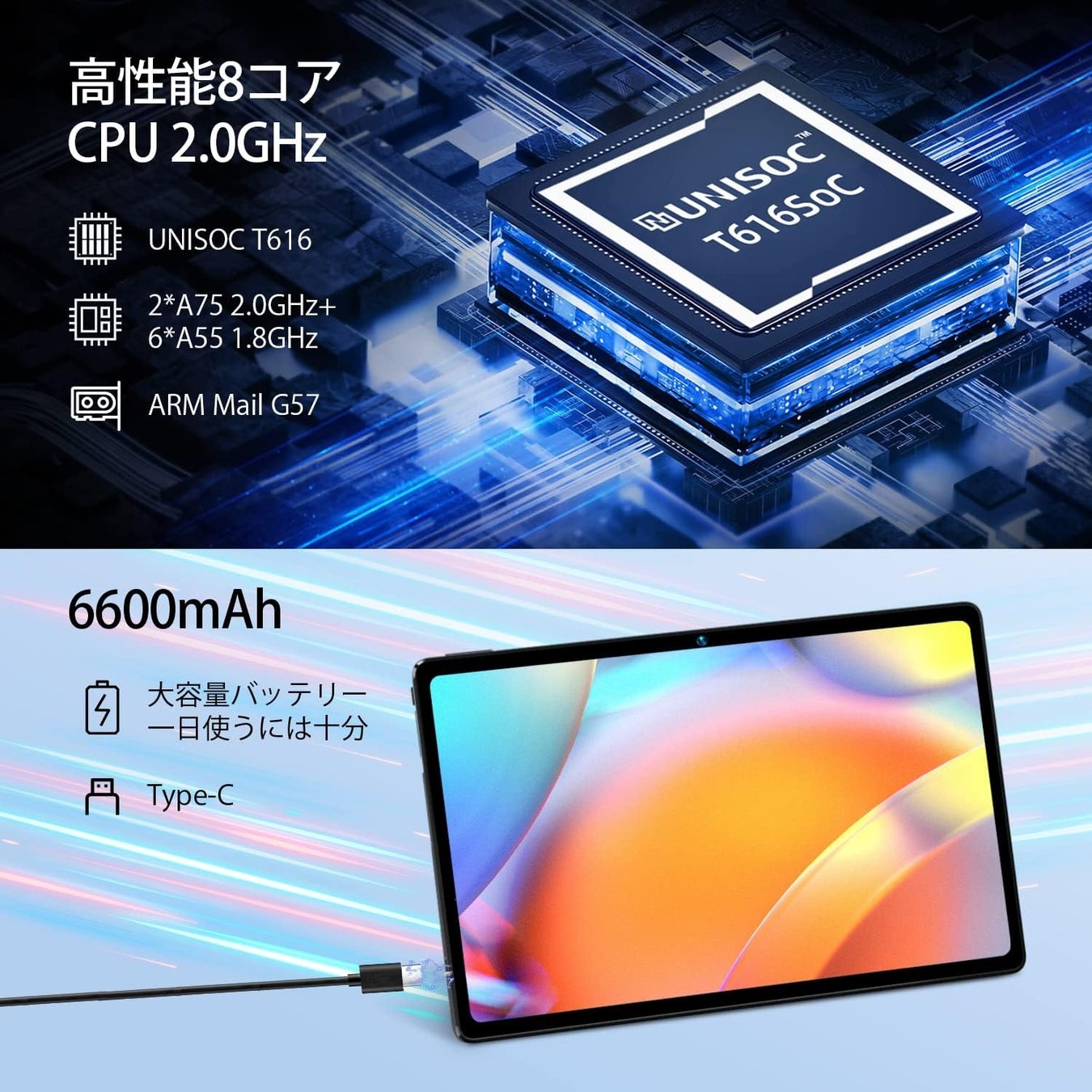 UNISOC T616の強力な8コア高速処理チップを搭載し、A75アーキテクチャコアを使用、最大周波数は2.0 Ghz対応、AnTuTu実行ポイントは255,000を超えます。ARM Mail G57グラフィックプロセッサを使用しているので、人気のモバイルゲームをすごく滑らかに遊ぶことができます。