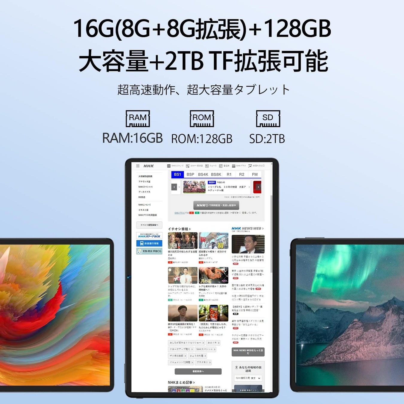【16GB(8GB+8GB拡張)+128GB+2TB拡張可能】BMAX I11Plus タブレットは16GBRAM、128GBの内蔵ストレージの元に、最大2TBまでのmicroSDカード/TF カード(FAT32フォーマットカードは別売り)の拡張可能なストレージです。容量を気にせずGoogle Playで 人気なアプリに対応でき、ビデオ、音楽、電子書籍、オンライン授業、ネットサーフィン、ゲームなど様々なエンターテイメントもこの一台で十分です。