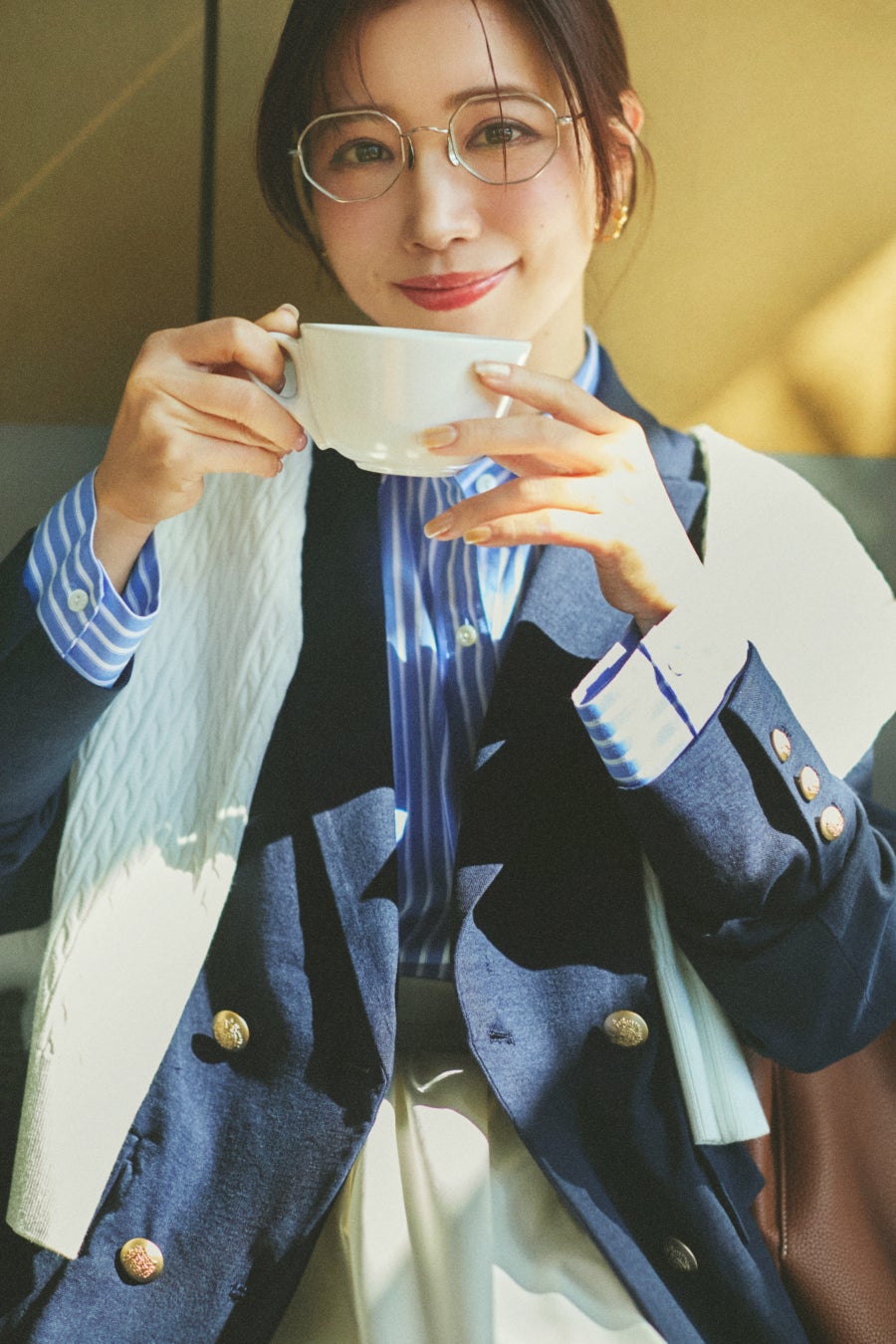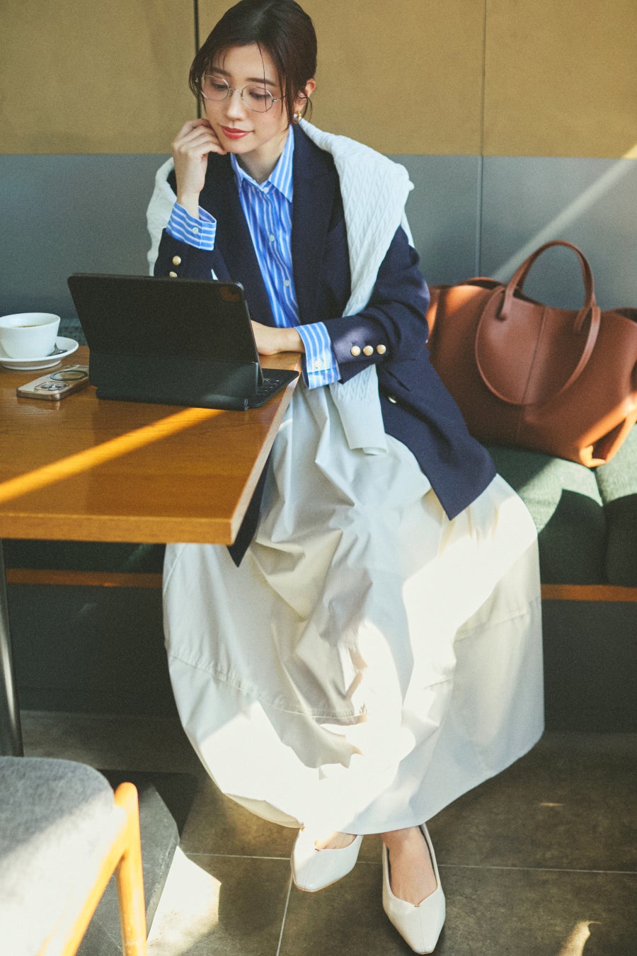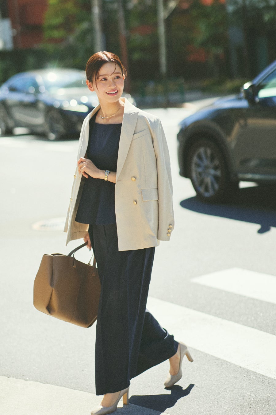 「忙しい朝は、余計なことをせずセットアップで潔く楽しみたい。 上下で合わせるだけで洗練された雰囲気が一気に高まり、無駄なく綺麗なお仕事スタイルが完成します。 ジャケットを羽織ることで全体がさらに引き締まり、信頼感のある印象に。」(志村さん)