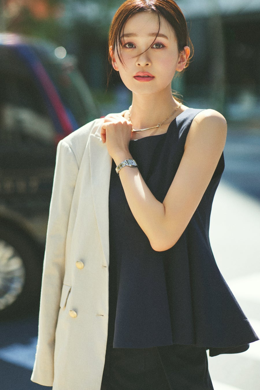 「ペプラムなのに甘すぎず、大人っぽく上品に着られる絶妙なバランスがお気に入り。 機能素材とは思えない洗練された雰囲気なのに、UVカットや吸湿速乾まで備わった『完璧すぎる』一枚です。 毎日洗えてノーアイロンで着られるから、忙しい朝も迷わず手に取ってしまいます。」(志村さん)