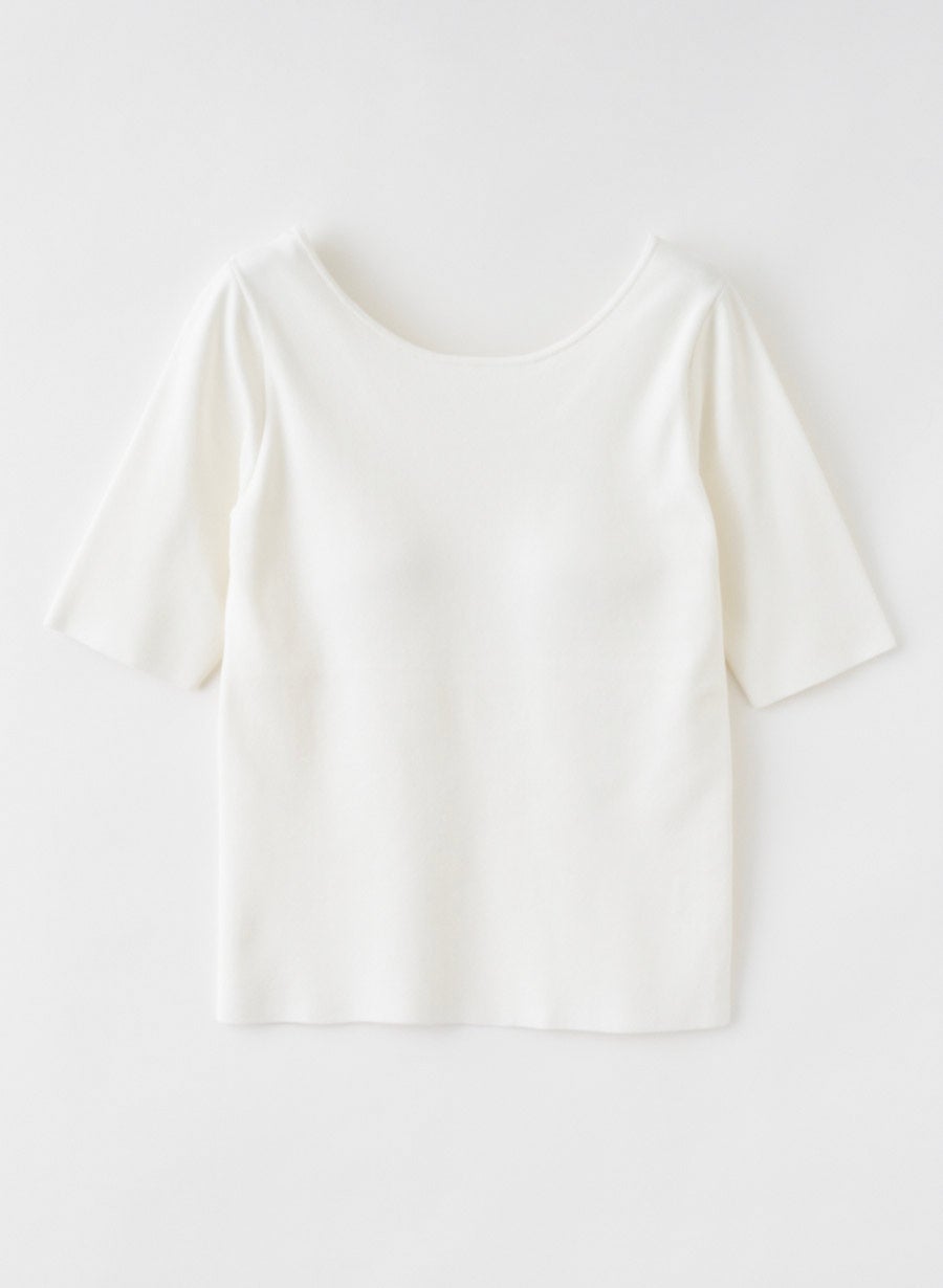 「首回りの開き具合が絶妙で、デコルテを綺麗に見せながらすっきりと着られるのが一番の魅力。 柔らかなニット素材にカップが内蔵されているので、締め付け感がなく驚くほどストレスフリーな着心地です。」(大村さん)