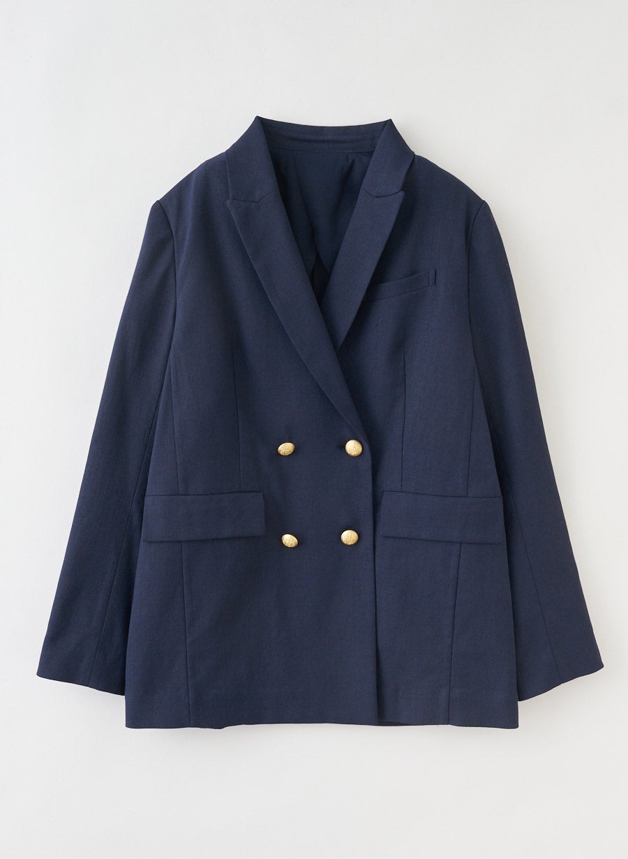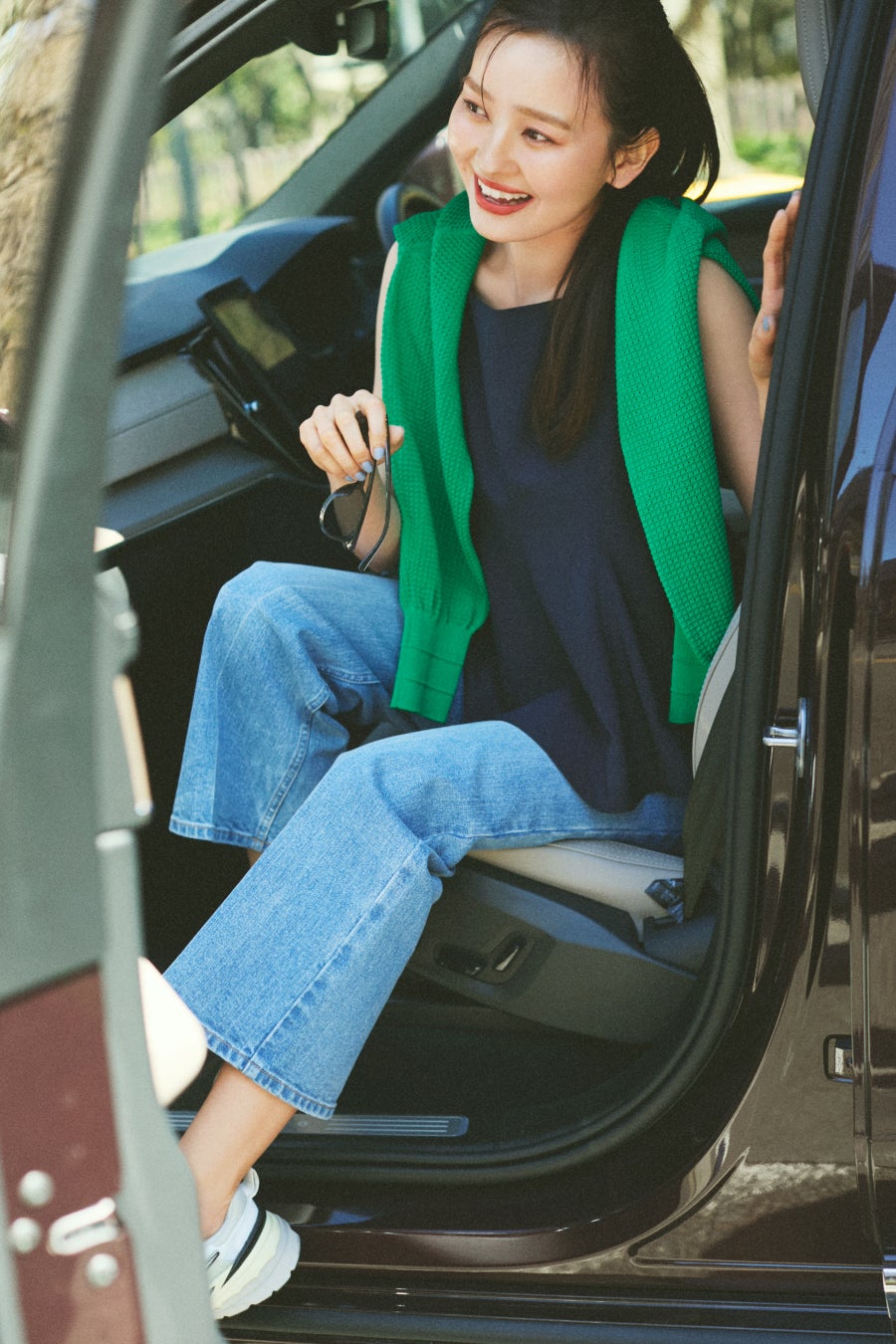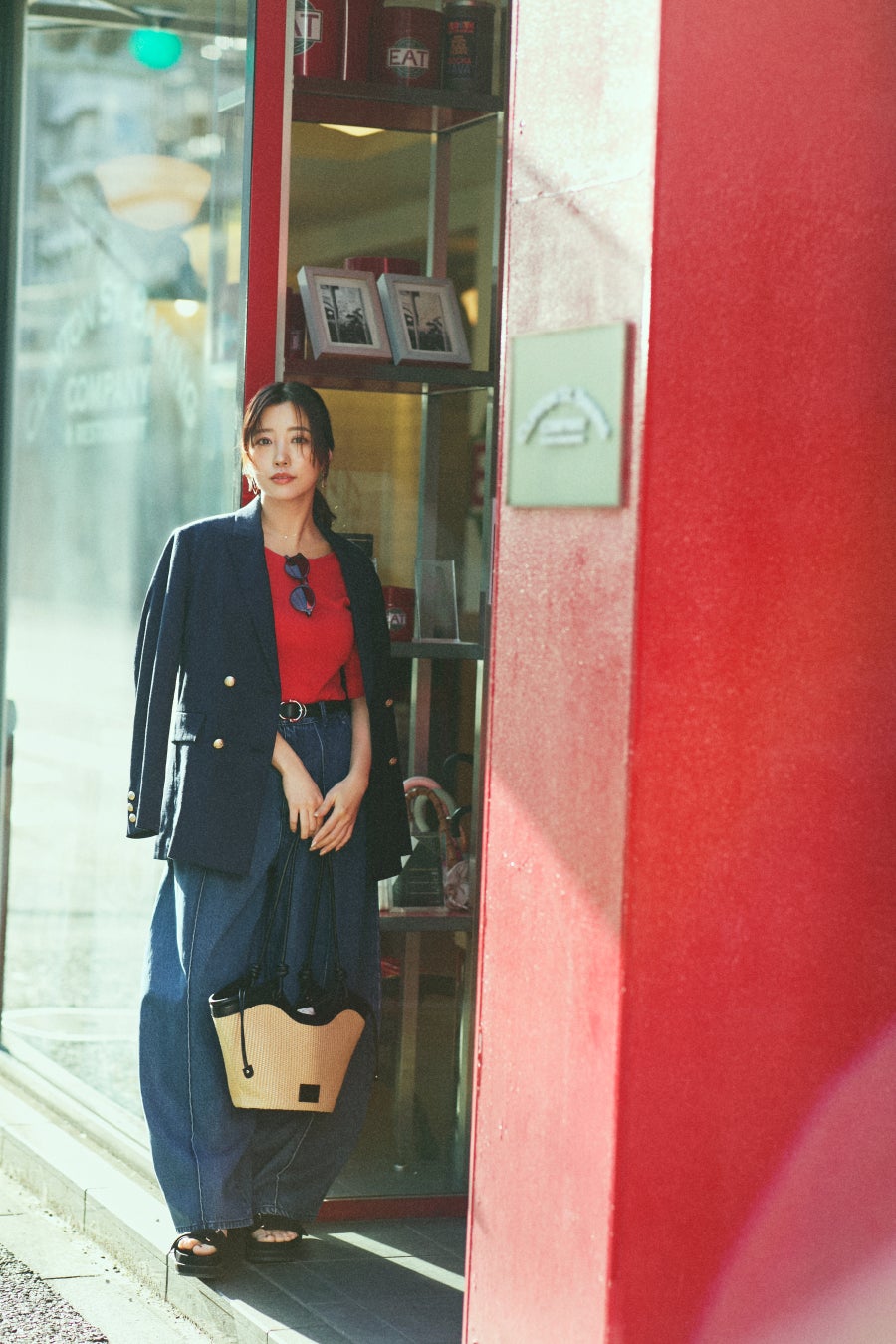 「休日の美容デーは、赤のトップスを主役にデニム×紺ブレで大人っぽいきれいめカジュアルに。ジャケットにUVカットや遮熱機能が備わっているので、強い日差しや暑さを気にせず外出を楽しめるようになりました。ラフさときちんと感のバランスがちょうどよく、これ一着でどこへでも行けると思える安心感があります。」(入江さん)