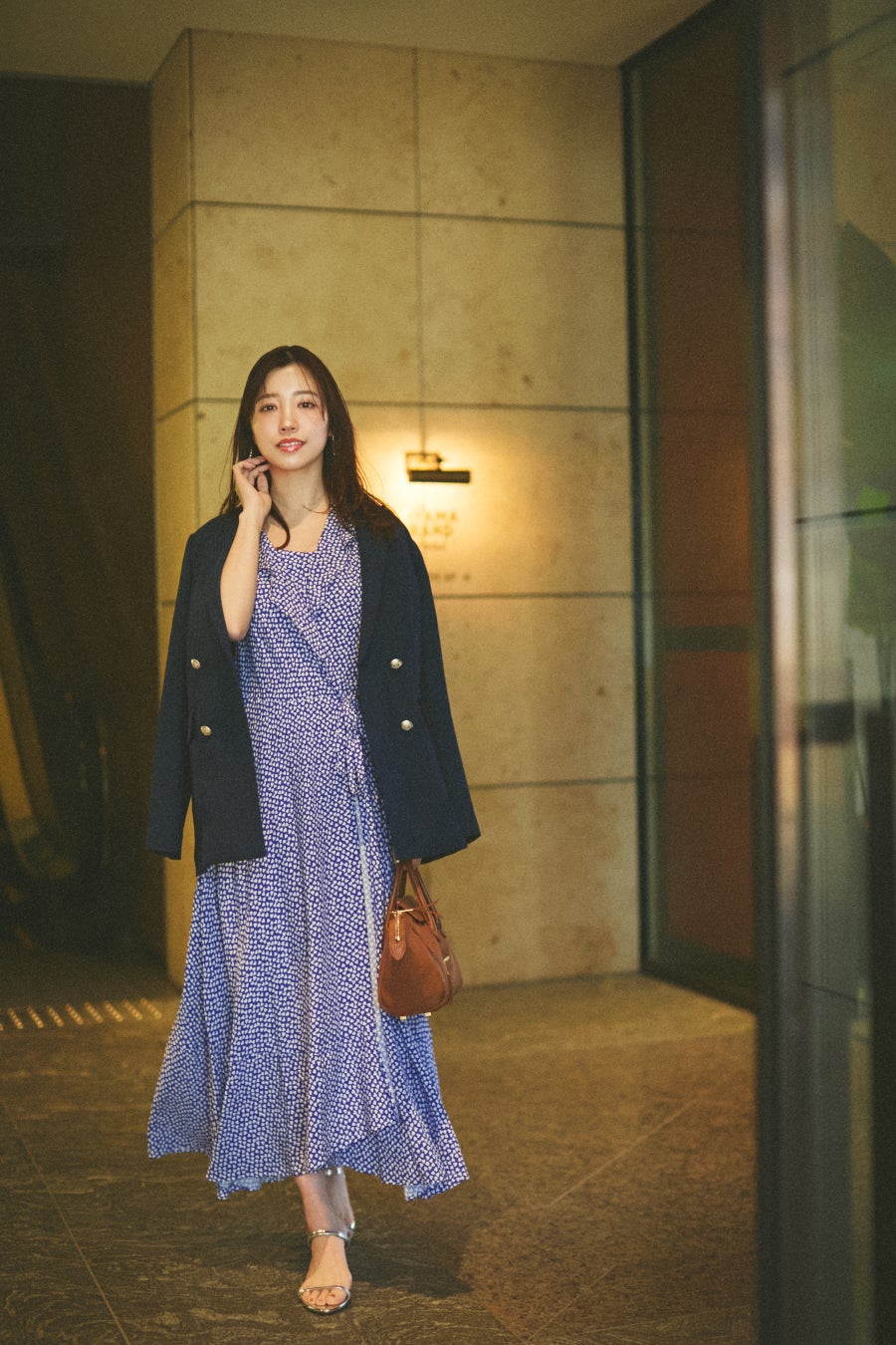 「特別な日のディナーは、ブルーのハート柄ワンピースに紺ブレを重ねた、品よく知的なワントーンスタイル。 揺れるシルエットの甘さをジャケットで引き締めることで、ホテルシーンにもふさわしいハンサムな華やかさが加わります。 移動中もシワを気にせず美しい状態をキープできるので、自信を持って次の予定へ向かえる安心の一着です。」(入江さん)