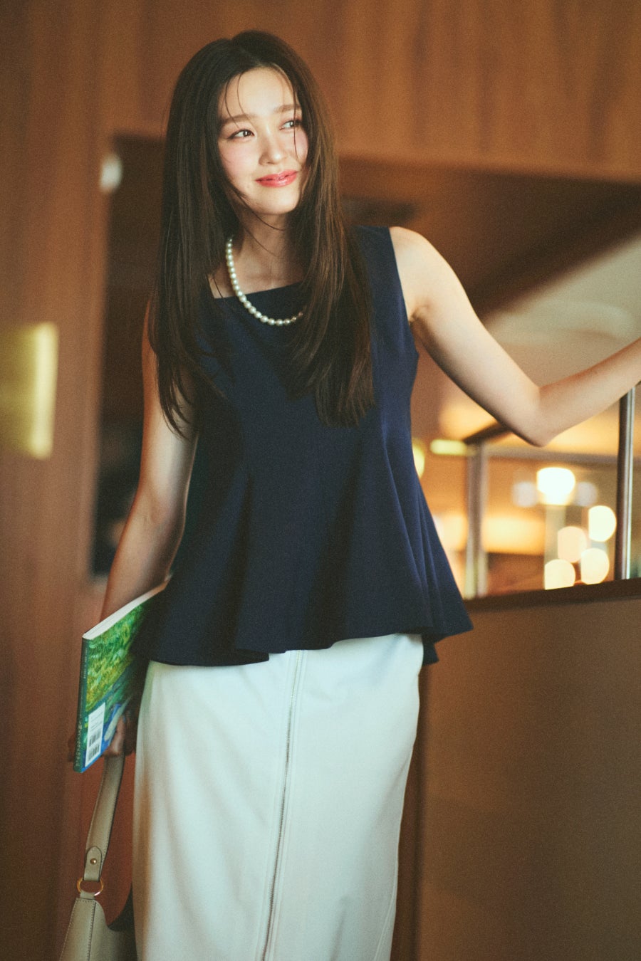 「休日の美術館は、ペプラムの立体感とタイトスカートの縦ラインを活かした、上品なきれいめスタイルで。 エレガントなスカートとも相性が良く、合わせるだけで洗練された女性らしいムードに。」(志村さん)