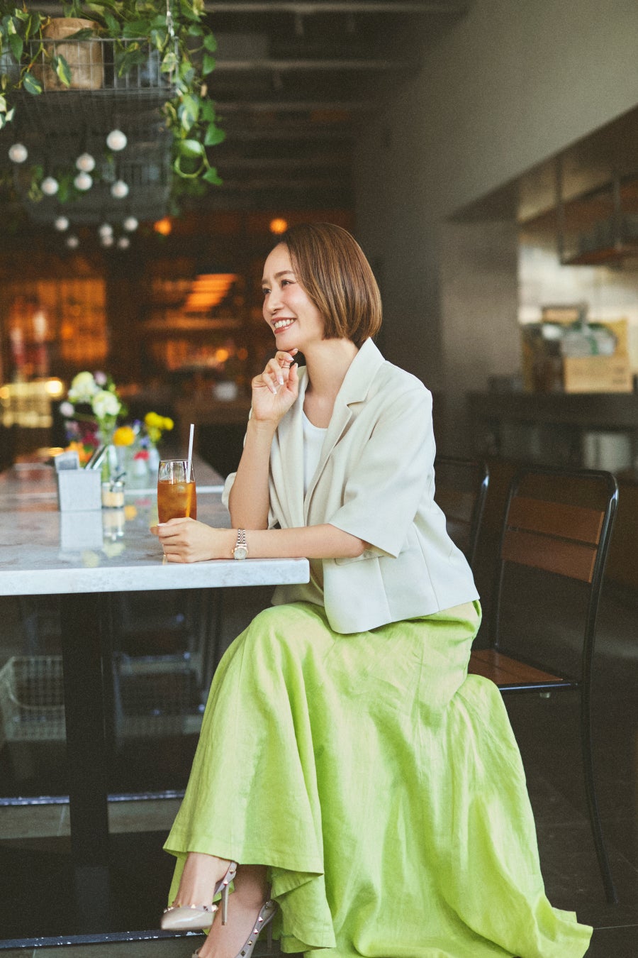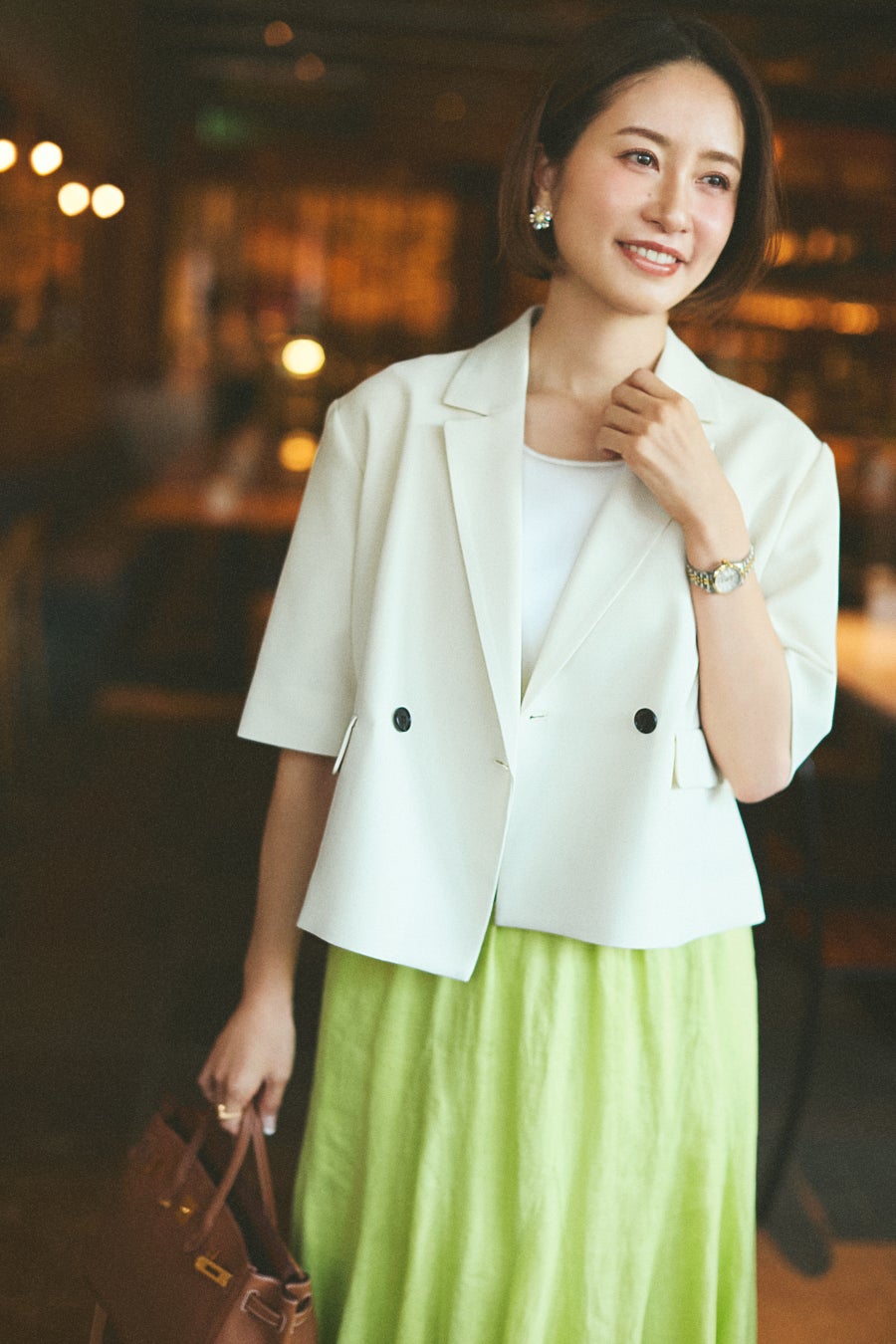 「お昼の会食は、相手に失礼のないようジャケットを羽織って、清潔感のあるきちんとスタイルに。カラースカートを合わせて、華やかさをプラスしました。 ジャケットを重ねてもインナーのニットがすっきり綺麗に収まるので、背筋をスッと伸ばして会話を楽しめます。」(大村さん)