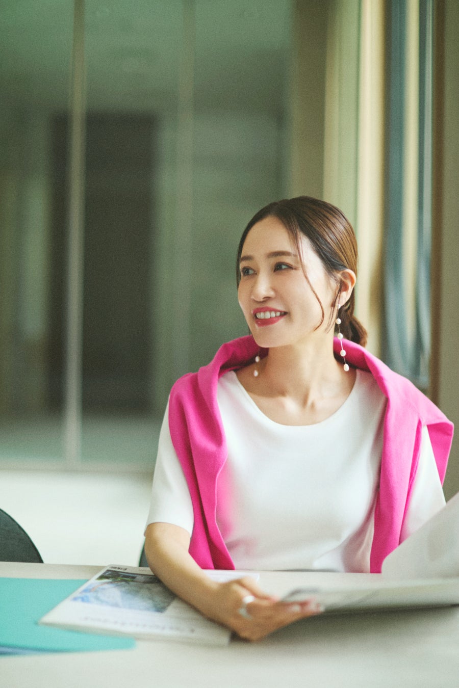 「会議の日は、内側からポジティブなエネルギーが湧いてくるような、春らしいピンクを顔周りに。 清潔感あふれる上下ホワイトのコーデに、ピンクのニットが柔らかなアクセントを添えてくれます。」(大村さん)