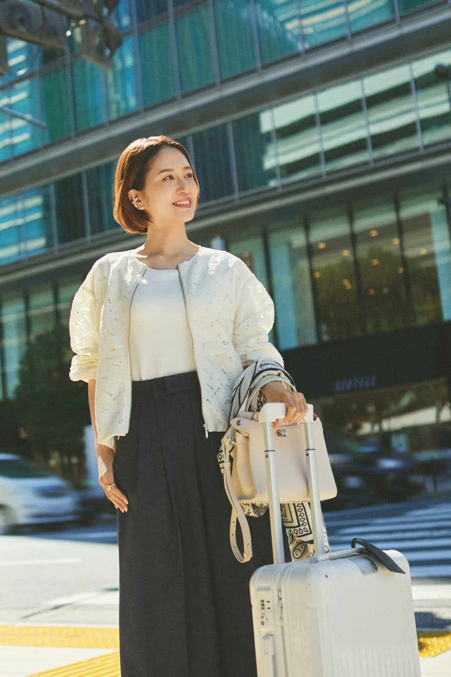 「出張の移動日は、カップ付きニットと柔らかい素材のパンツで、ストレスフリーを追求。 移動中の乗り物での寒さ対策には、透け感のある羽織りを重ねて、軽やかで洗練された印象に。」(大村さん)