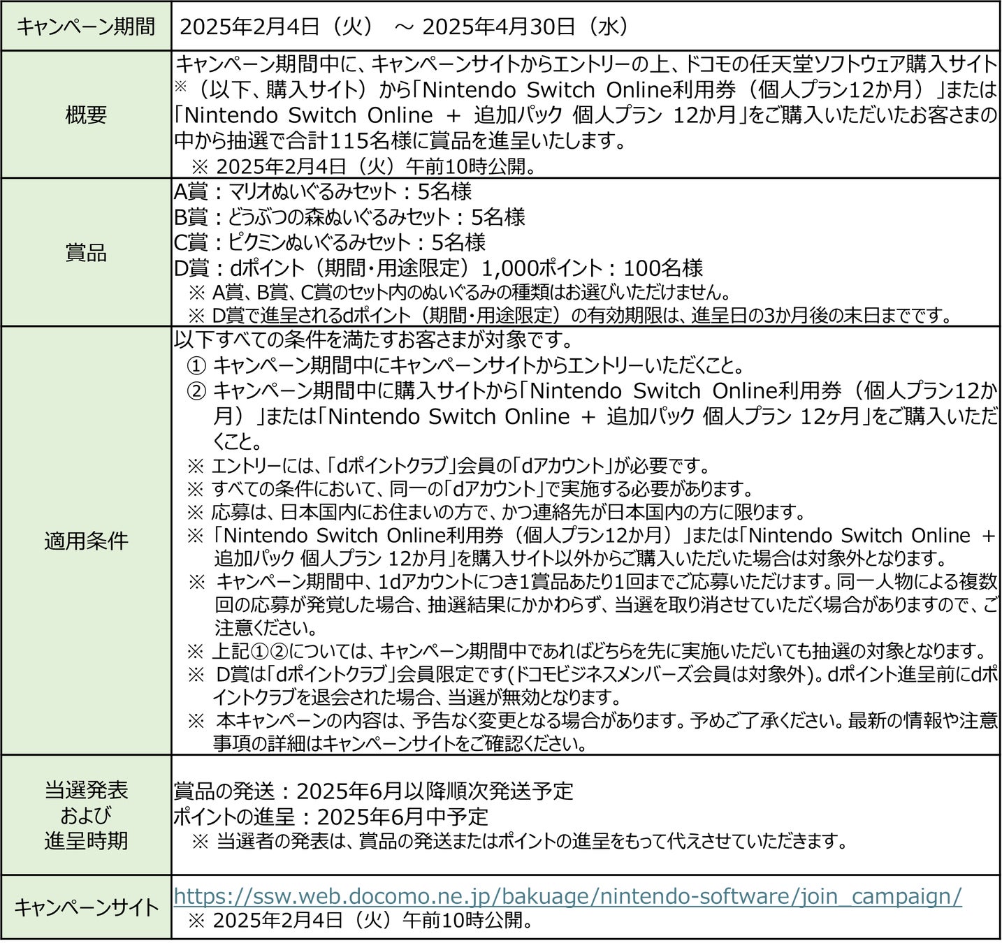 株式会社NTTドコモ(以下、ドコモ)は、「Nintendo Switch Online」(以下、本サービス)および「Nintendo Switchソフト(ダウンロード版)」(以下、ゲームソフト)の取扱いを2025年2月4日(火)から開始※1し、ドコモからの対象サービスお申込みでdポイント(期間・用途限定)を進呈する特典「爆アゲ セレクション※2」(以下、本特典)の対象サービスに追加いたします。