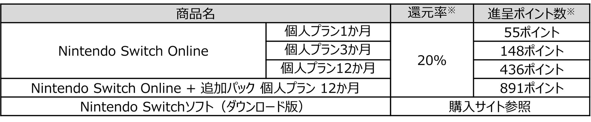 ※1 本特典の対象は適用条件を満たした方のみとなりますが、それ以外の方も、「Nintendo Switch Online」「Nintendo Switchソフト(ダウンロード版)」のご購入条件を満たした場合、「Nintendo Switch Online」「Nintendo Switchソフト(ダウンロード版)」をご購入いただくことが可能です。