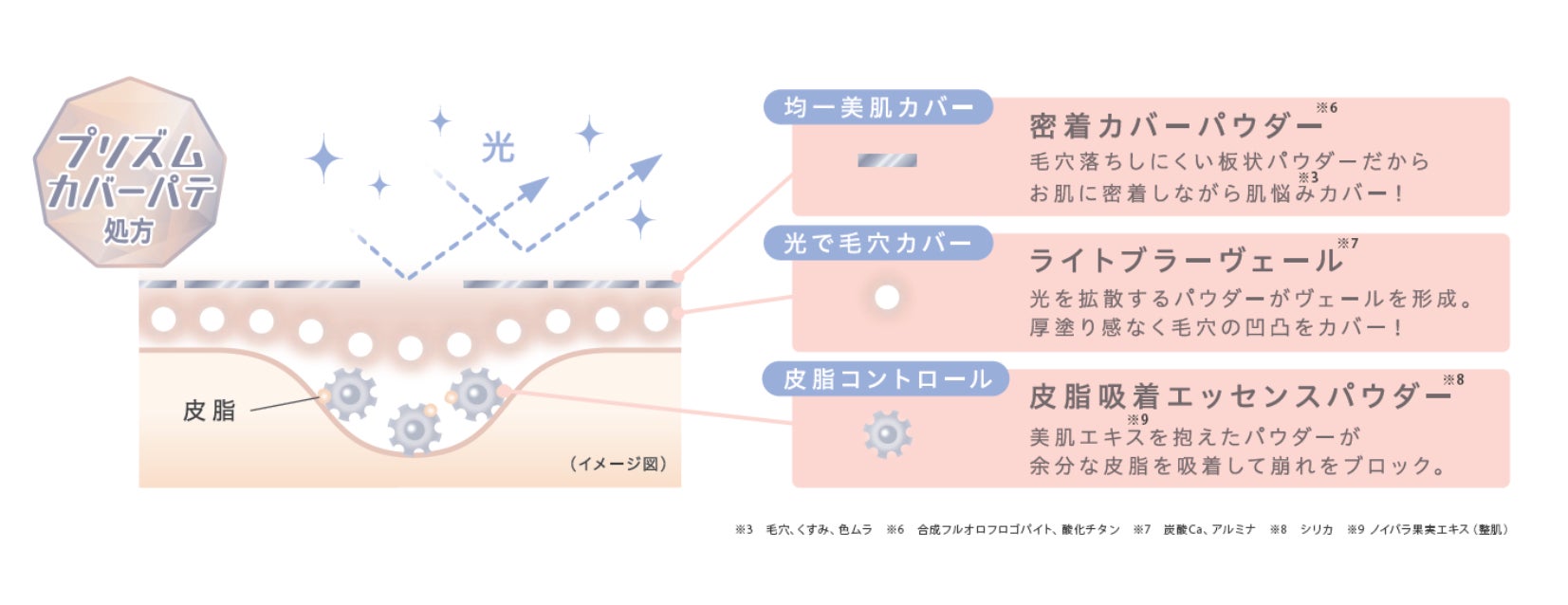 毛穴落ちしにくい板状のパウダーで、肌悩み※3をカバーする『密着カバーパウダー※6』、光を拡散するパウダーがヴェールを形成して毛穴の凹凸を厚塗り感なくカバーする『ライトブラーヴェール※7』、美肌エキス(ノイバラ果実エキス/整肌成分)を抱えたパウダーが余分な皮脂を吸着する『皮脂吸着エッセンスパウダー※8』で、1日中毛穴崩れをブロック。