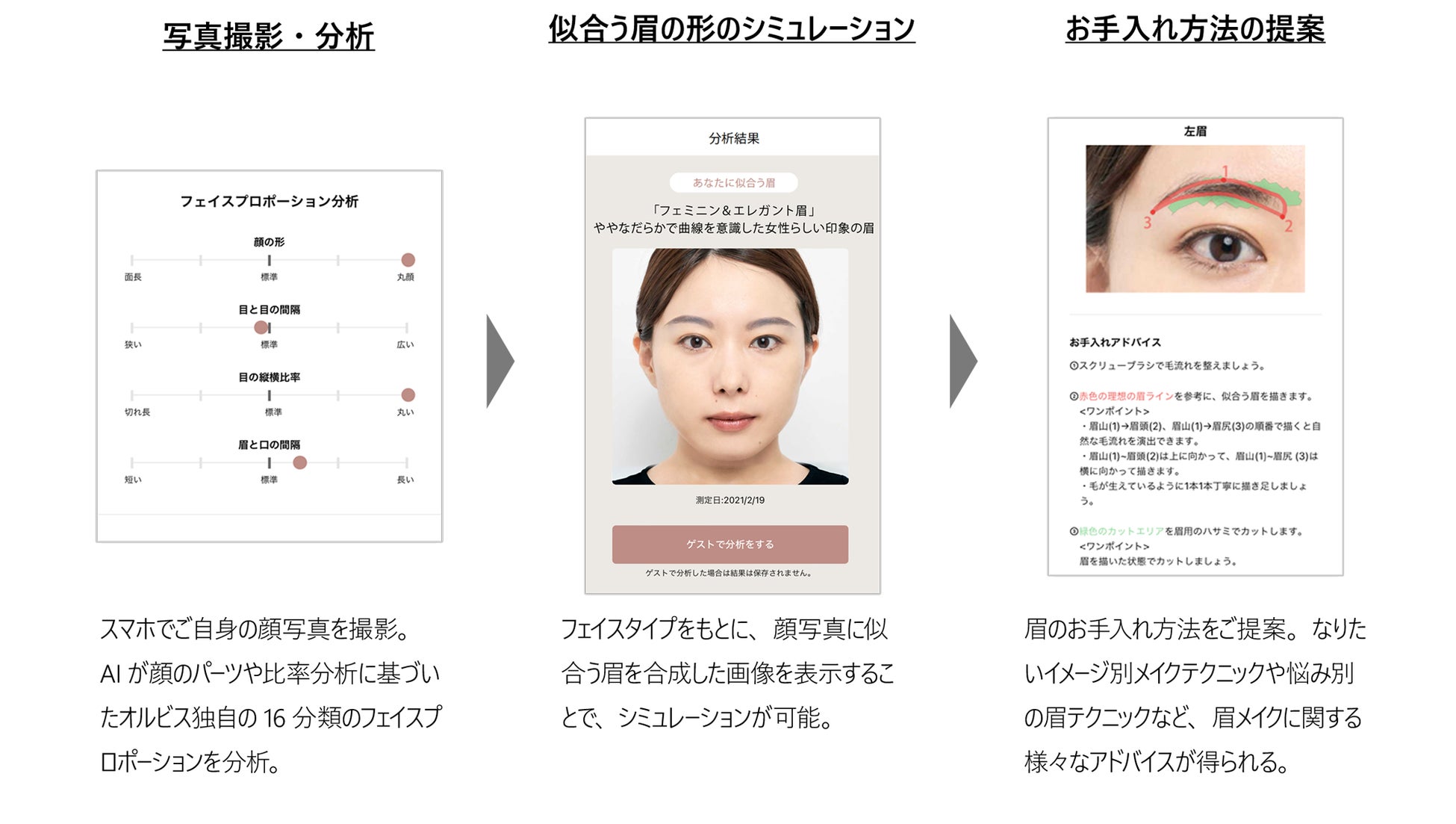 顔の額縁と言われる眉毛は、顔の印象を左右する重要なパーツの一つですが、男性女性共に「自分に似合う眉が分からない」「眉のお手入れを始めてみたいが、何から手を付ければいいか分からない」といったように、お悩みの多いパーツでもあります。『AIアイブローシミュレーター』は、スマホで写真を撮るだけで、AIが顔のパーツや比率分析に基づいたオルビス独自の16分類のフェイスプロポーション分析から、似合う眉の形とお手入れ方法をご提案いたします。