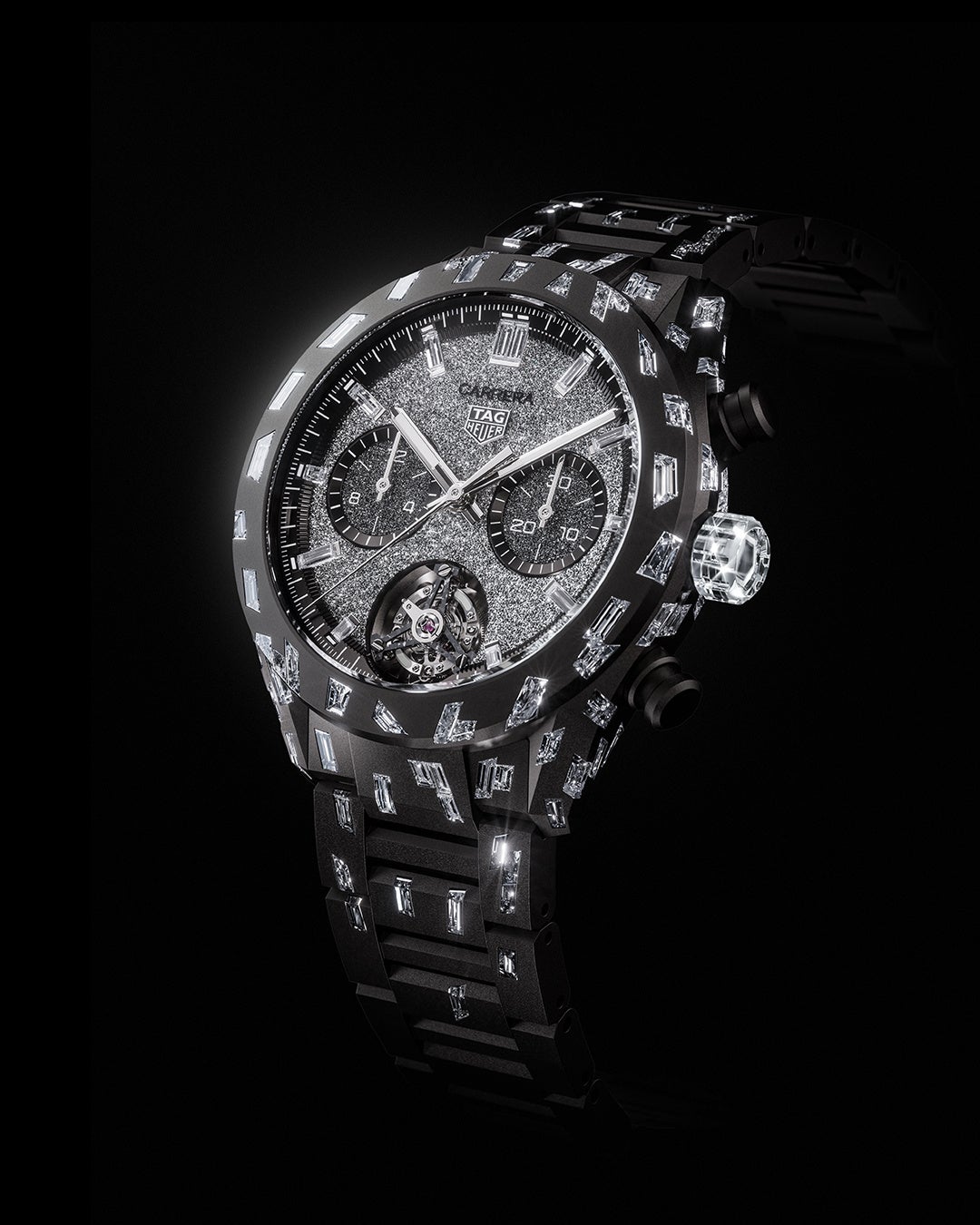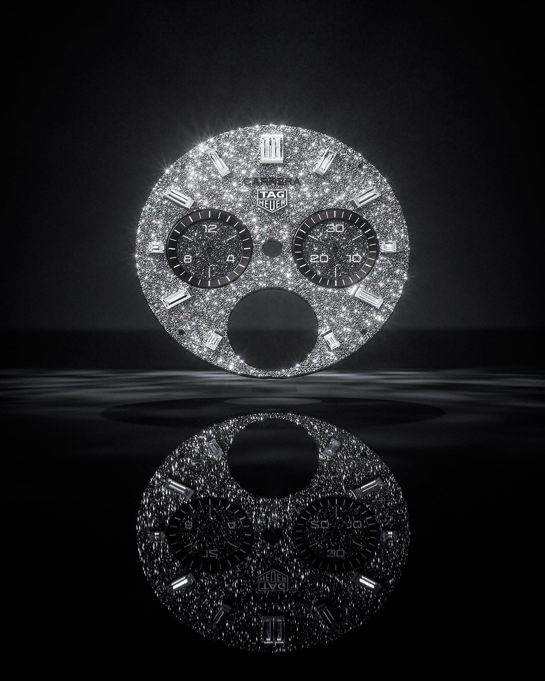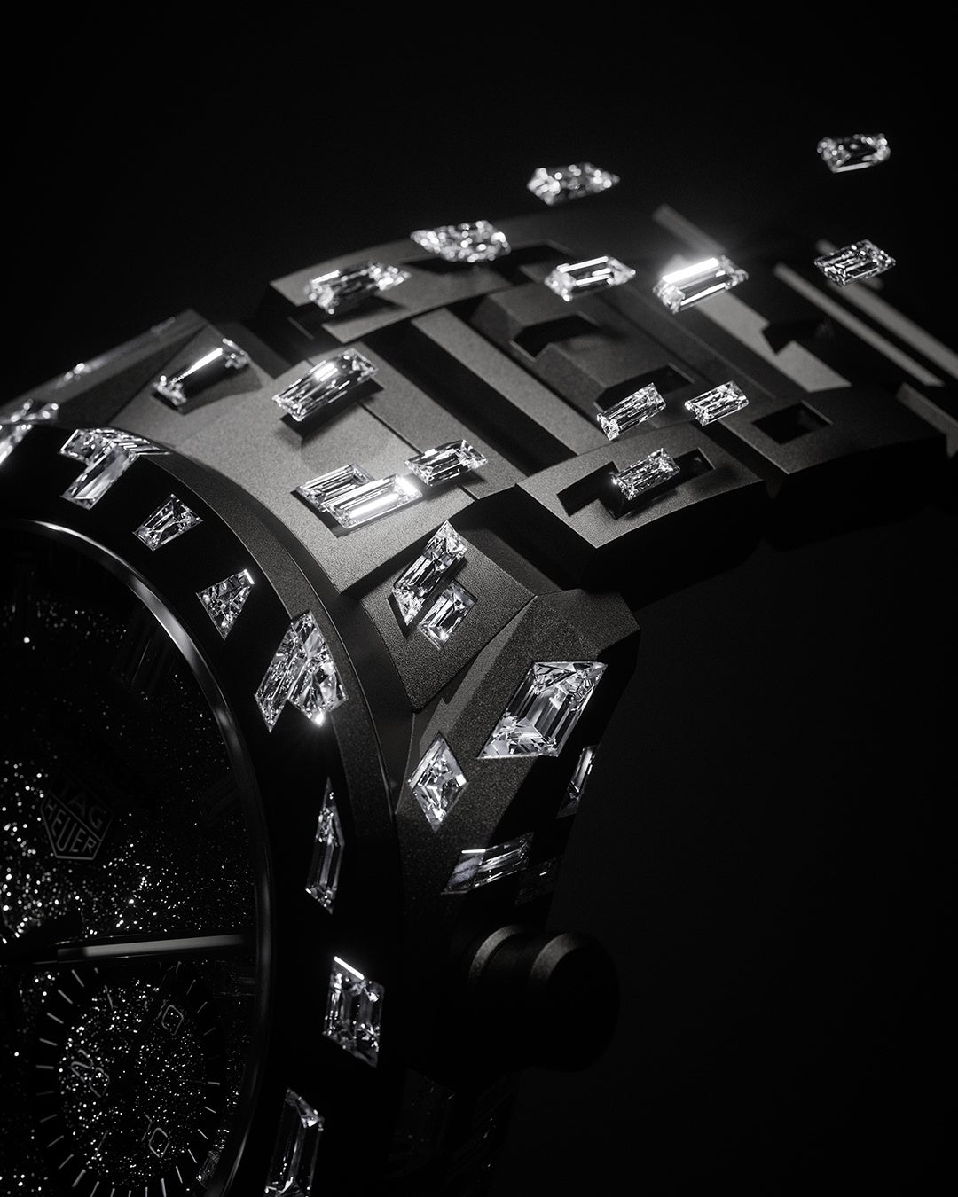 スイスの高級時計ブランド タグ・ホイヤーは、革新的技術である「ディアマン ダヴァンギャルド」により2022年に初めてラボグロウンダイヤモンドをクロノグラフのケース、リューズ、ダイヤル、インデックスに使用することに成功しました。今年は業界をリードする最先端のCVDの専門技術をさらに発展させ、カスタマイズされたラボグロウンダイヤモンドを、アルミニウム製のベゼルとブレスレットに独創的な形状で追加しました。