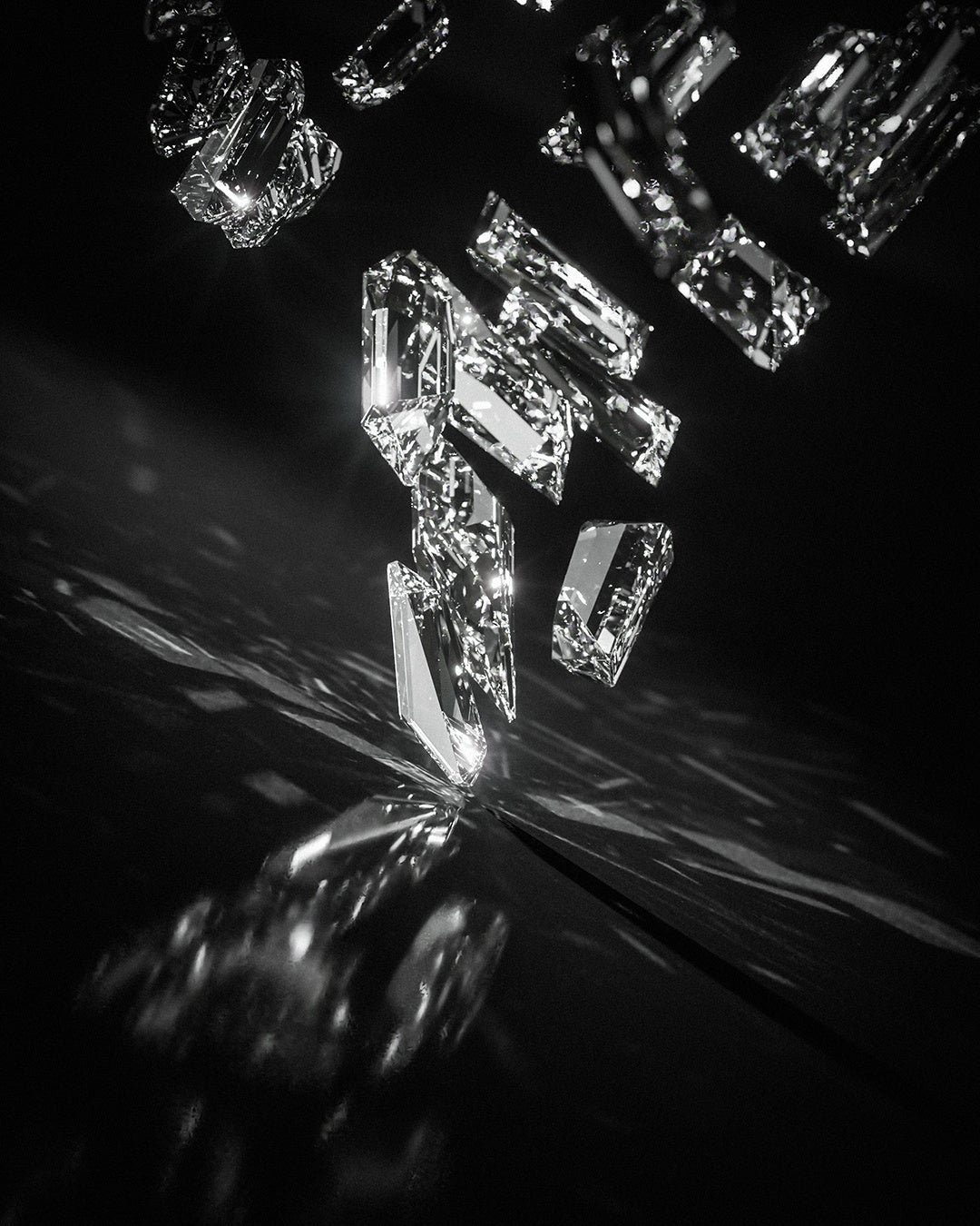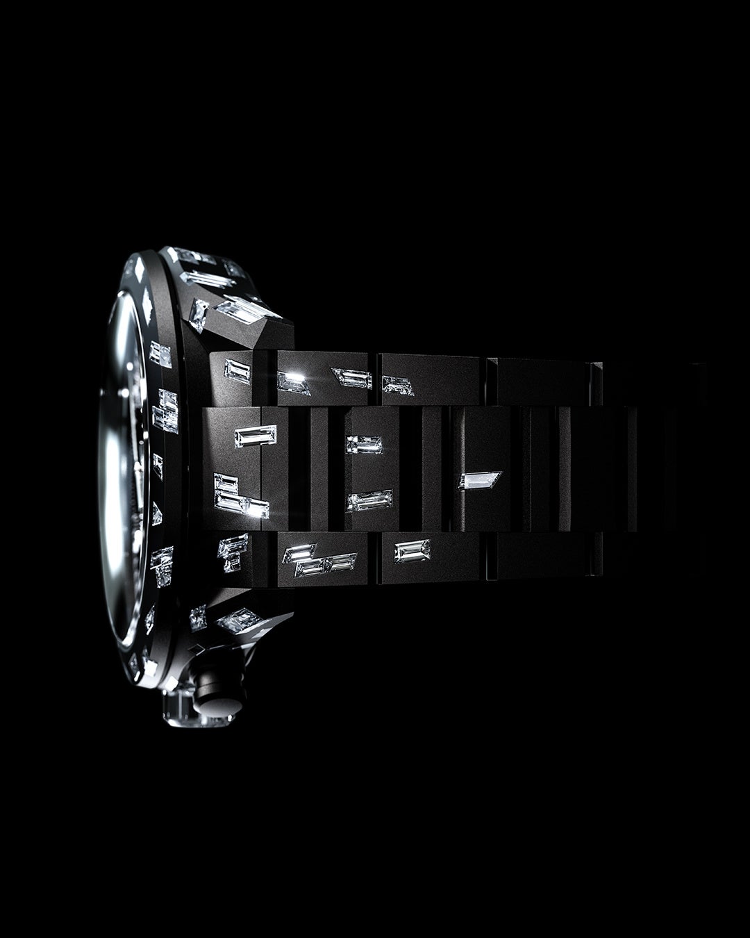 44mmケース、ベゼル、ブレスレットは、洗練されたブラックのサンドブラスト加工のアルマイト製です。想像をかき立てる形状のラボグロウンダイヤモンドが全体にあしらわれています。ケースには4.3カラット48個、ベゼルには26個合計1.9カラット、ブレスレットには34個合計1.9カラットのラブグロウンダイヤモンドを使用しています。