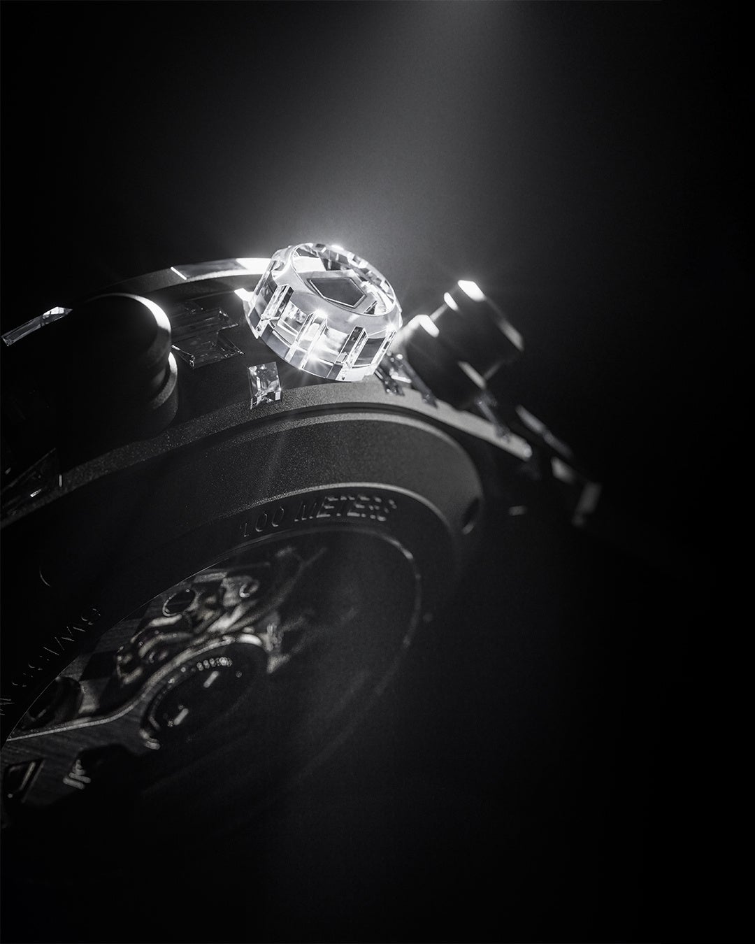 リューズには2.5カラットのラボグロウンダイヤモンドを1個使用し、カットを最適化することでシャープかつすっきりとしたフィット感を実現しています。2時と4時位置にある2つのステンレススティール製クロノグラフプッシャーはブラックDLCコーティングで強化されており、ダイヤモンドのリューズは機能的でありながら美しいジュエリーとして輝きを放っています。